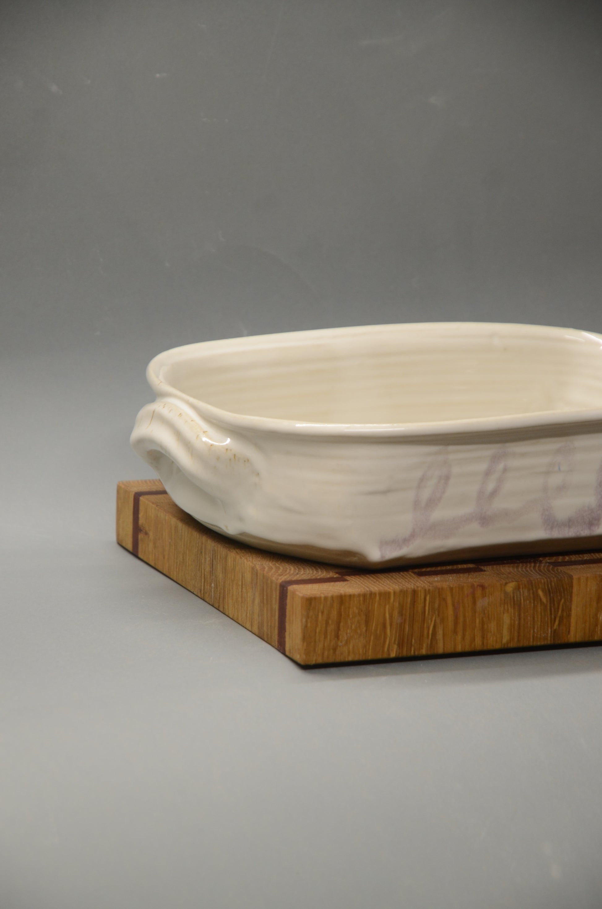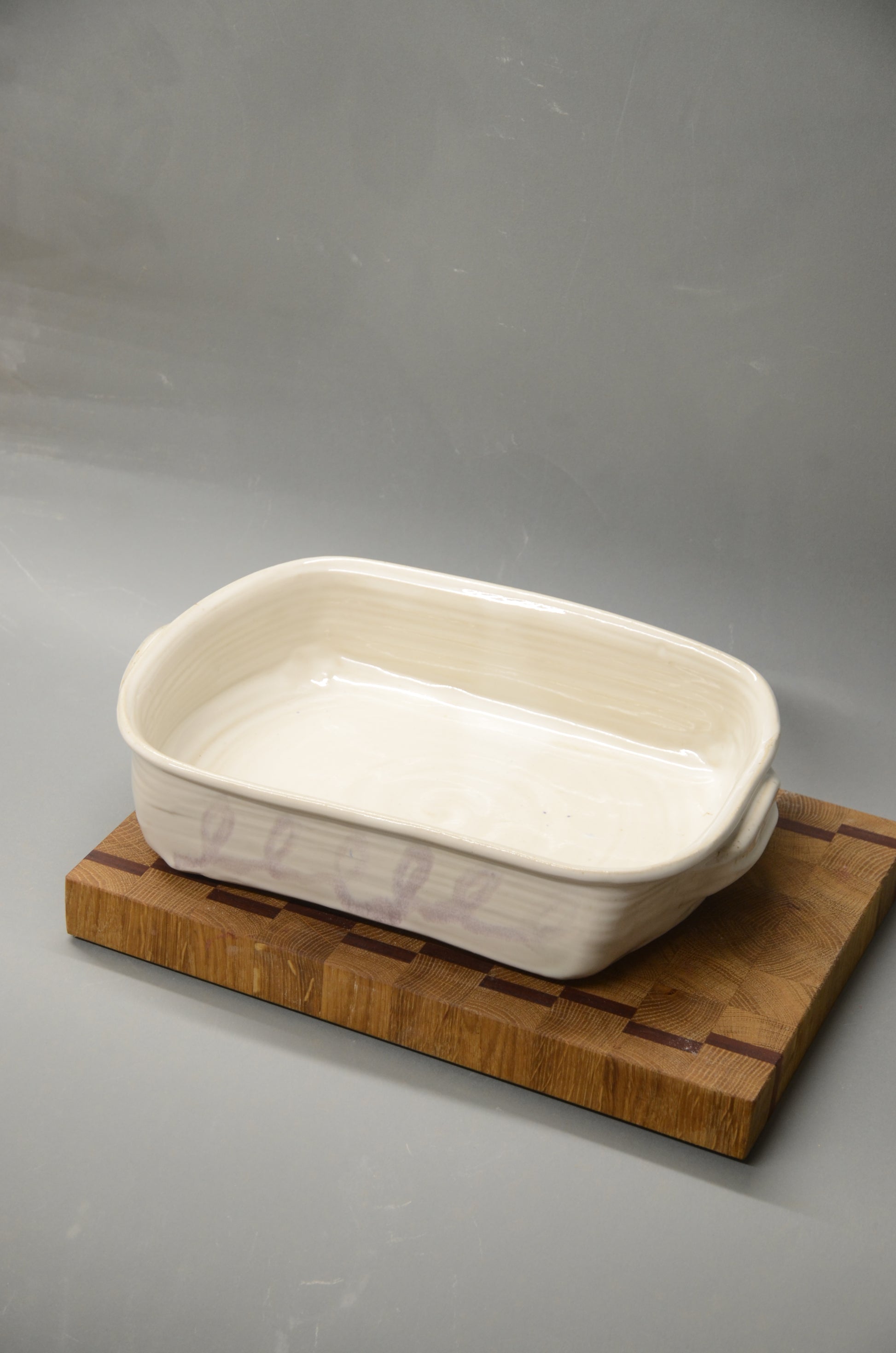 Diese Auflaufform wurde von mir per Hand an der Töpferscheibe aus Steinzeugton gedreht, in ihre eckige Form geformt und nach einem ersten Brand sorgfältig glasiert und ein zweites Mal gebrannt.