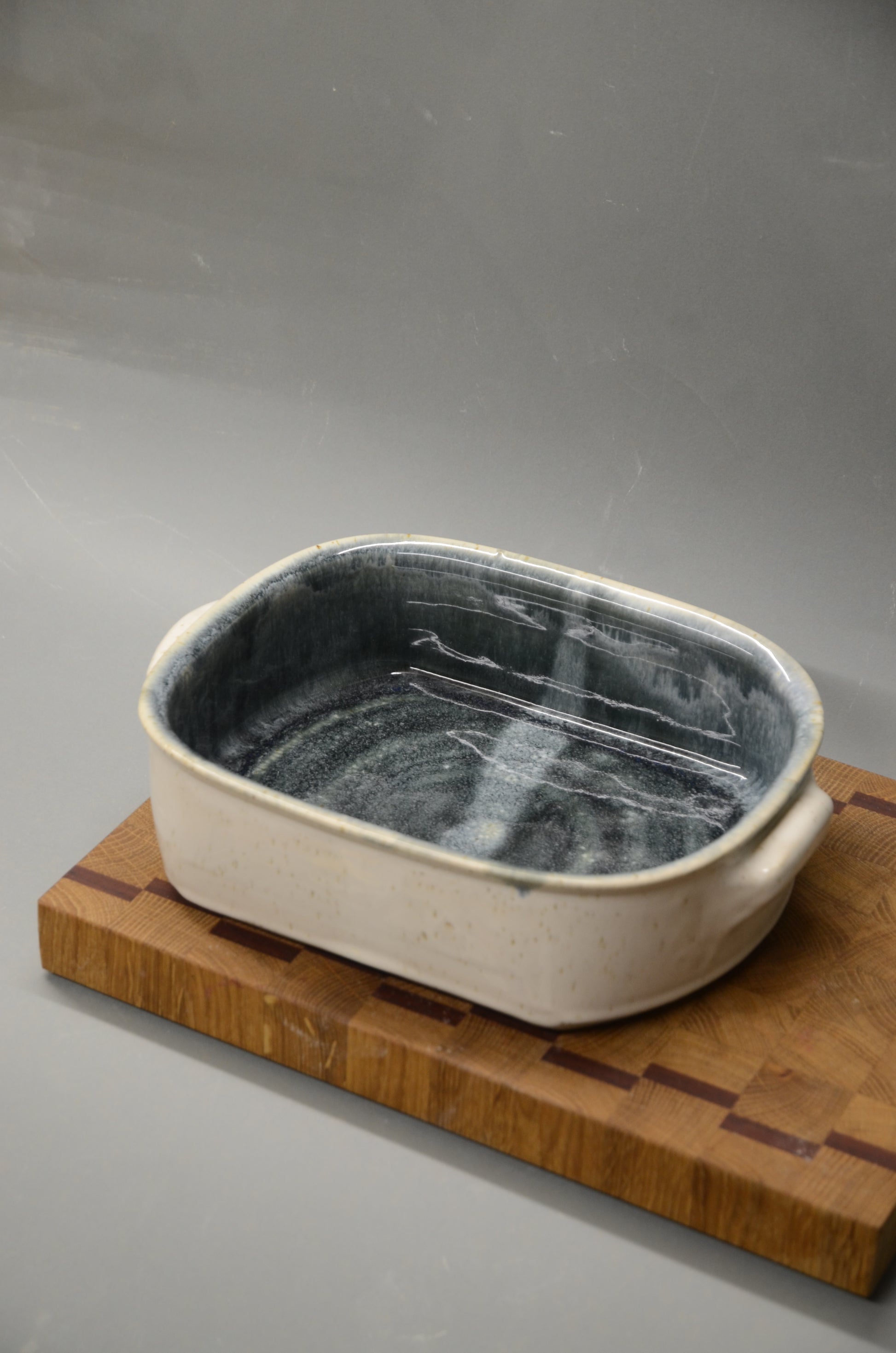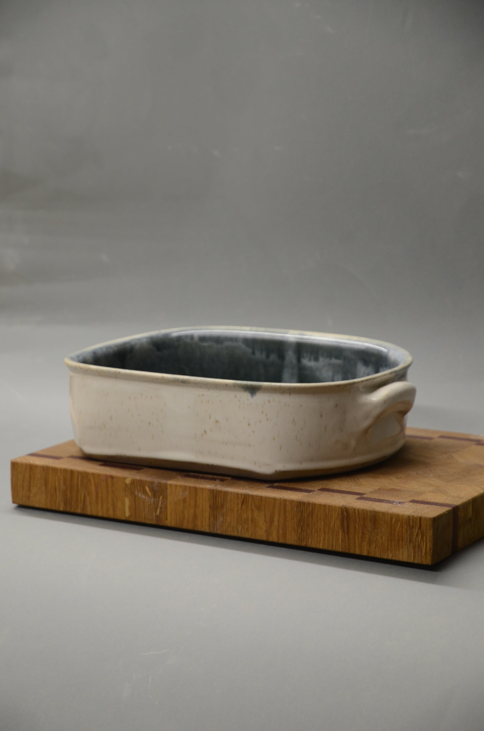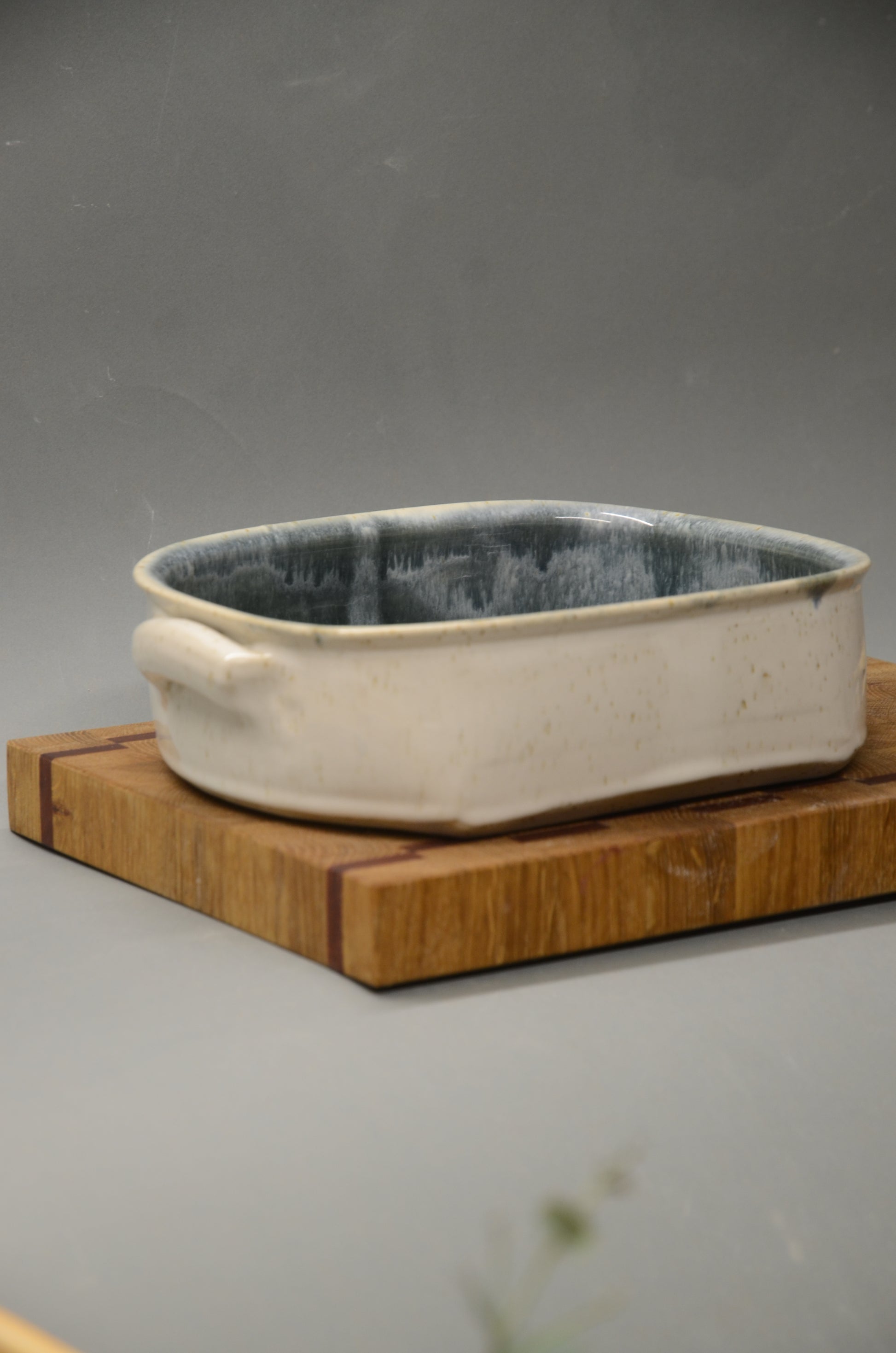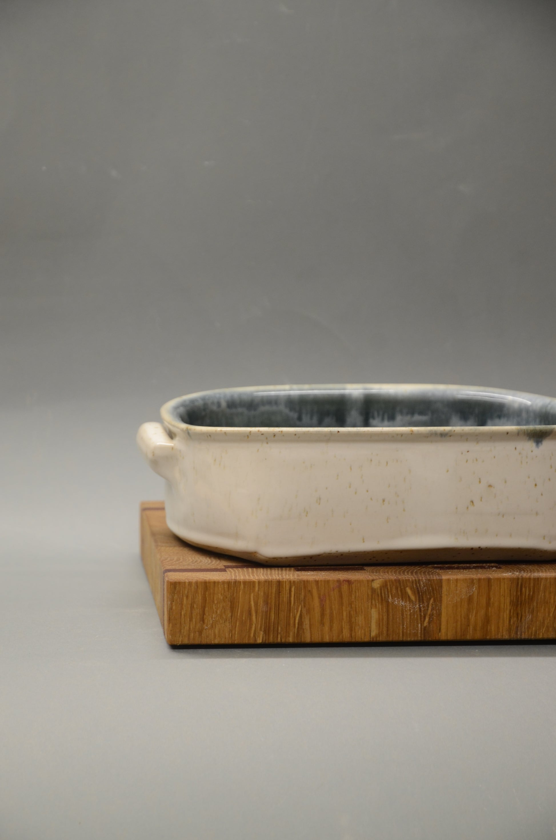 Diese Auflaufform wurde von mir per Hand an der Töpferscheibe aus Steinzeugton gedreht, in ihre eckige Form geformt und nach einem ersten Brand sorgfältig glasiert und ein zweites Mal gebrannt.