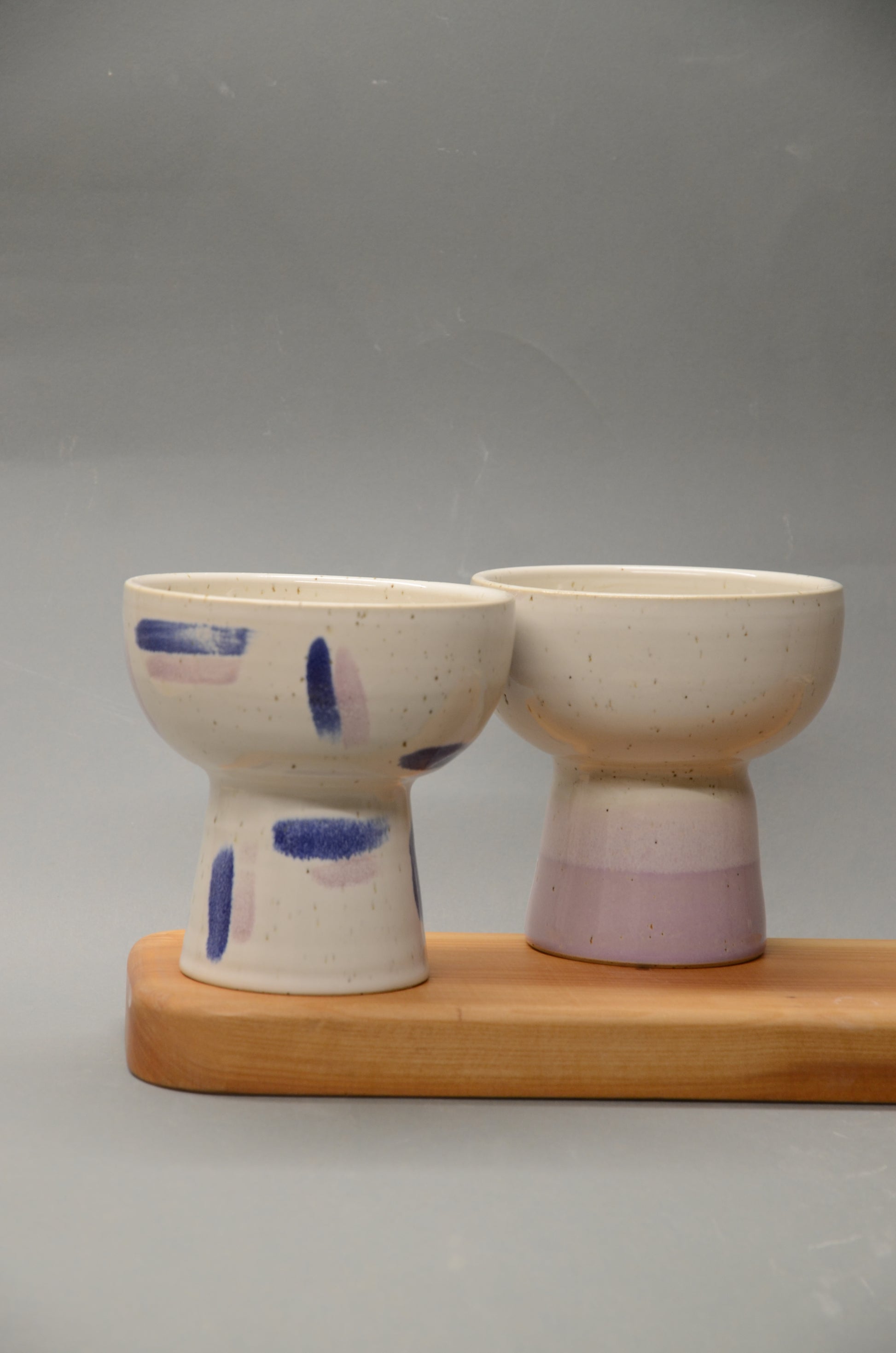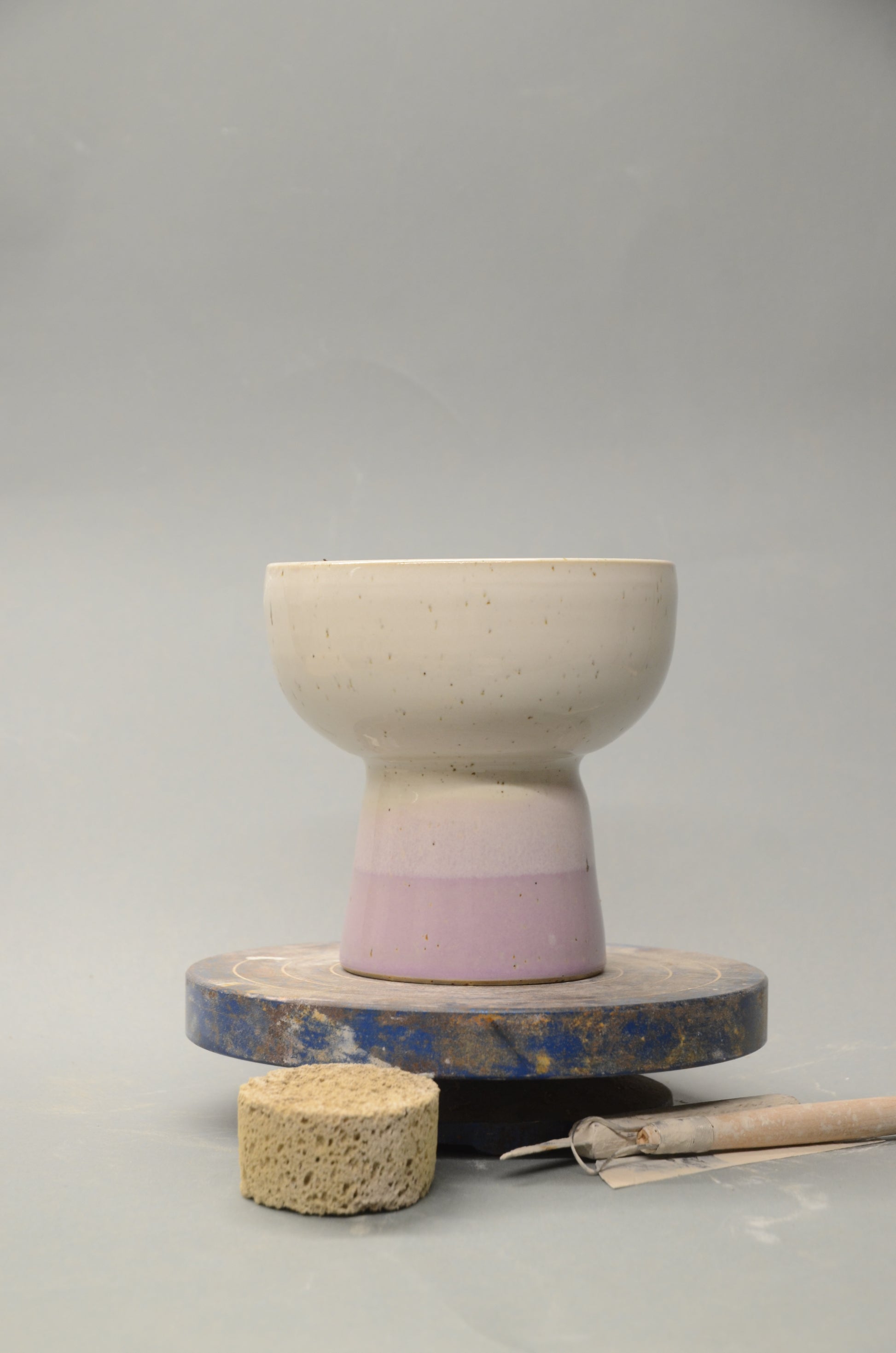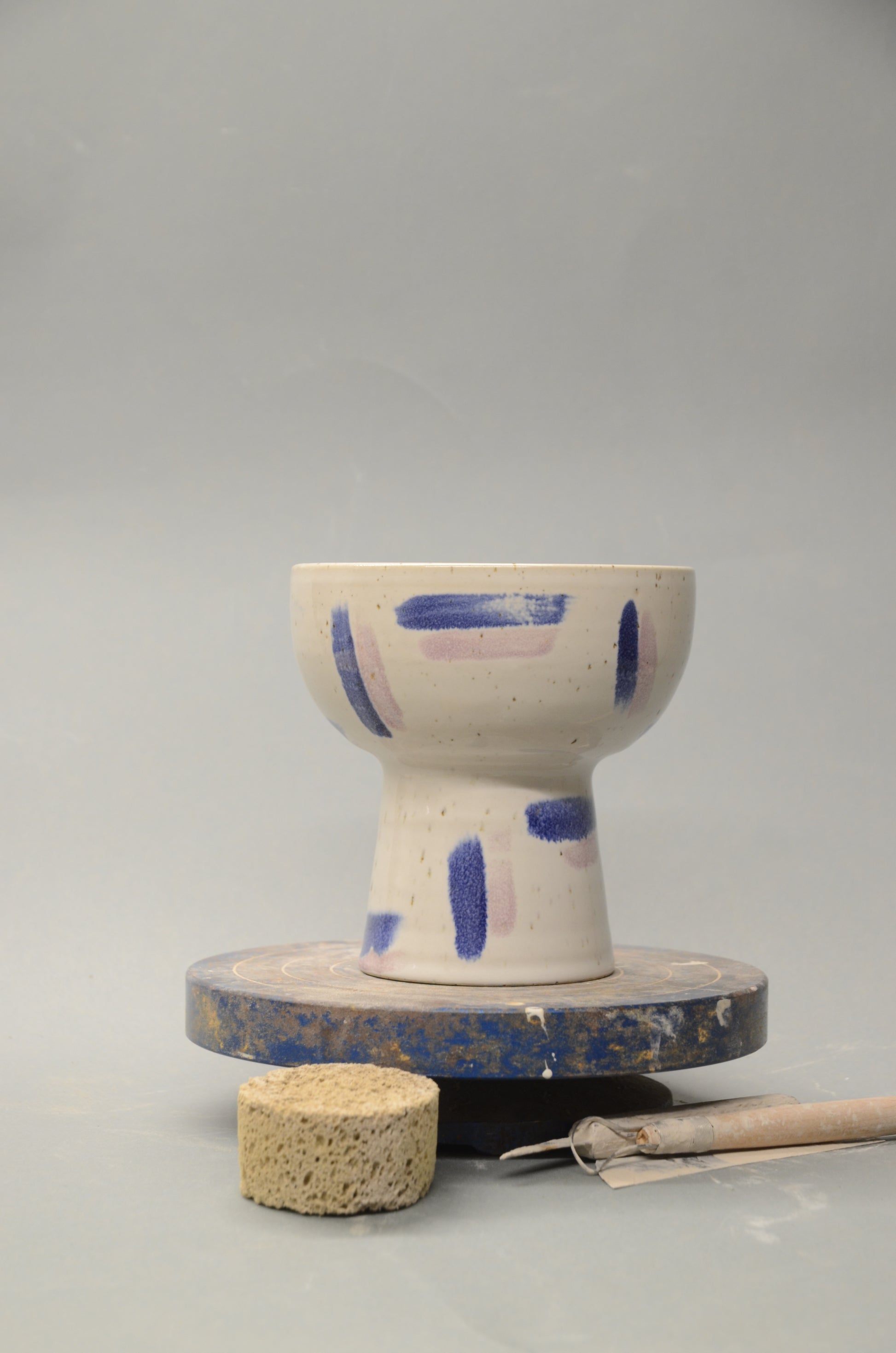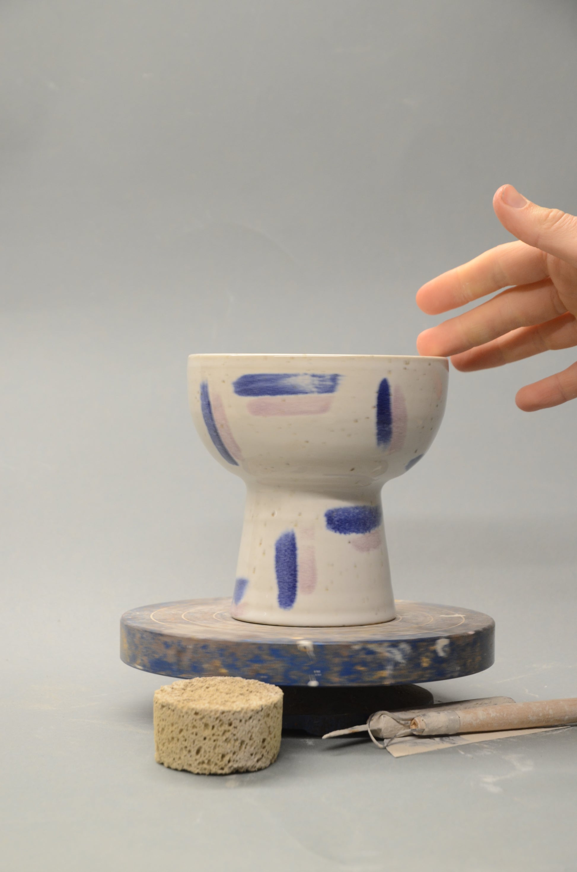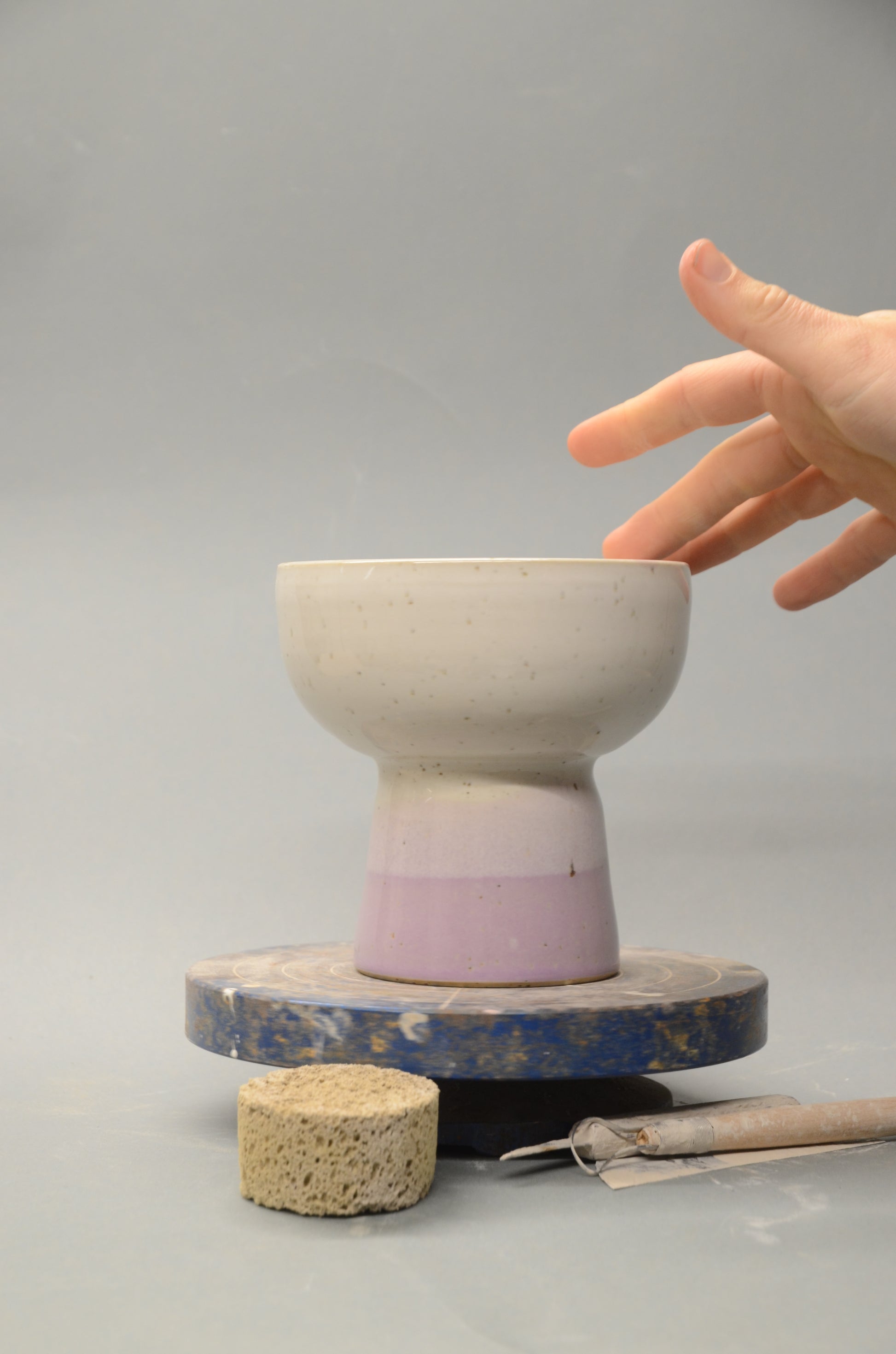 Diese erhöhte Schale wurde von mir per Hand an der Töpferscheibe aus Steinzeugton gedreht in zwei Teilen gedreht, abgedreht, verbunden und nach einem ersten Brand sorgfältig glasiert und ein zweites Mal gebrannt.