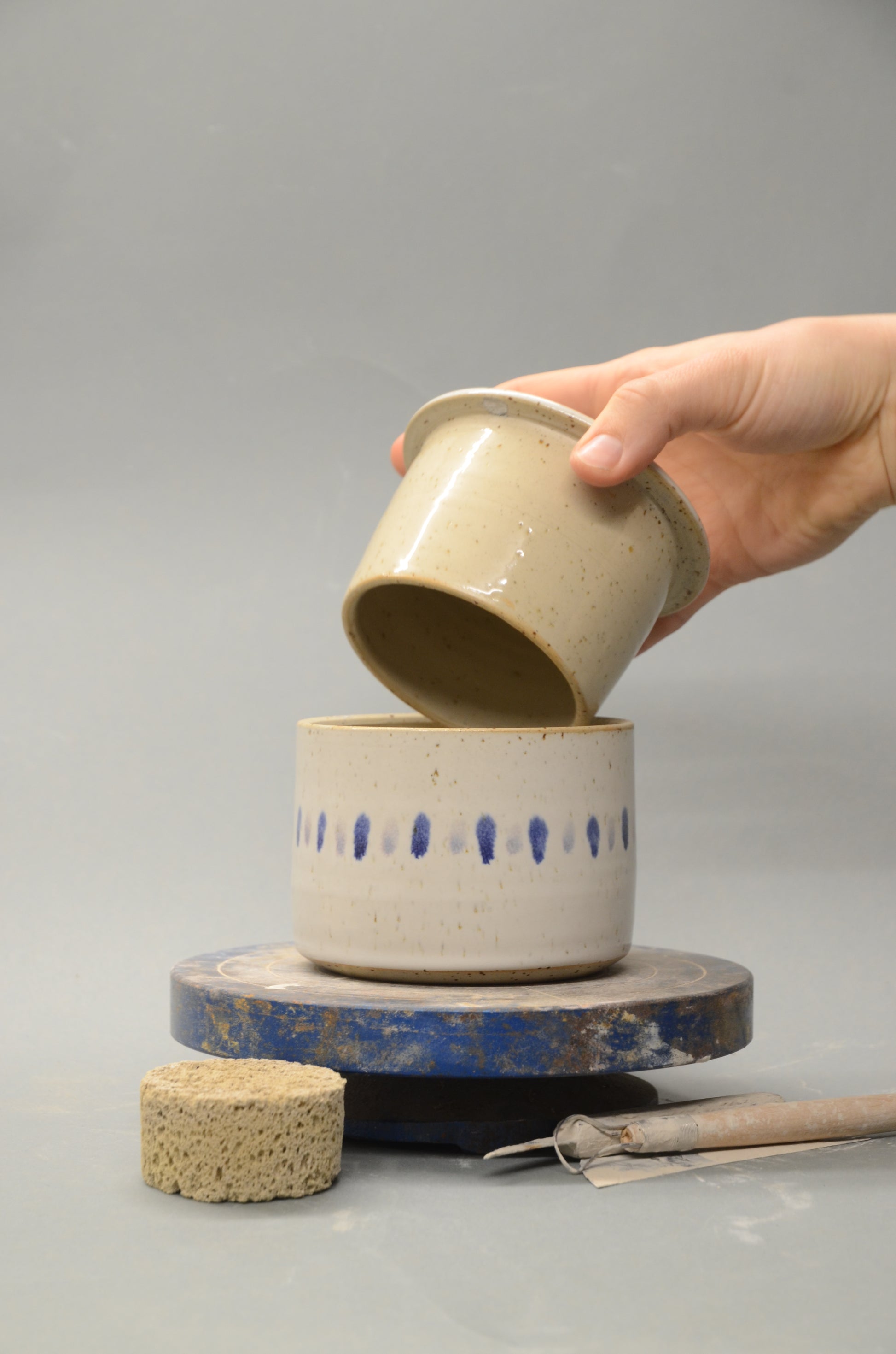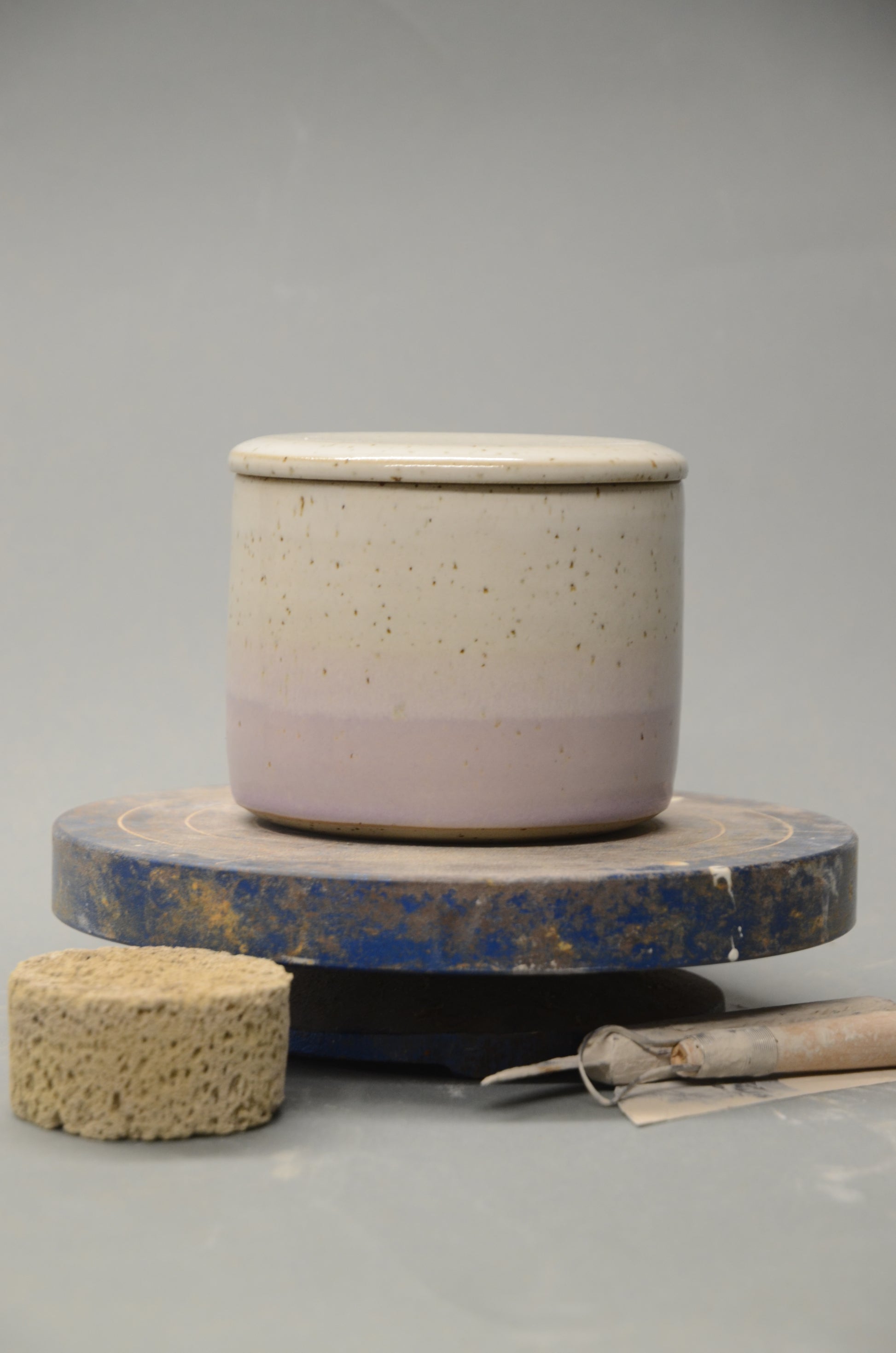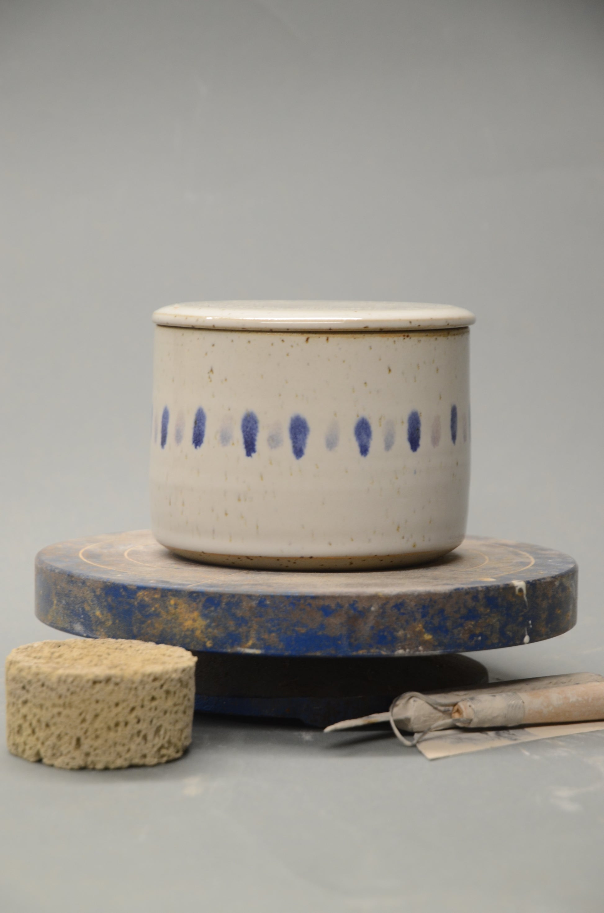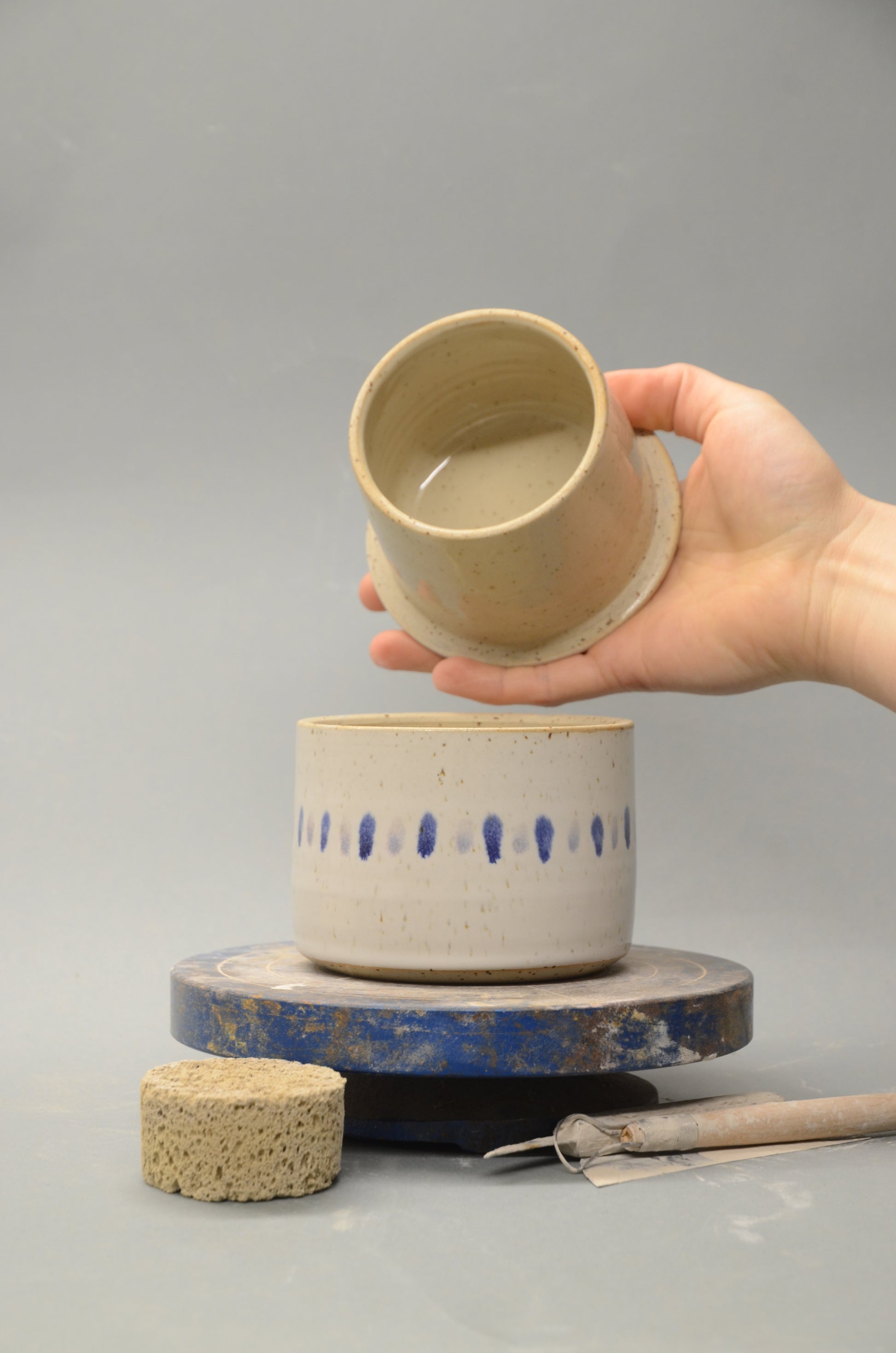 Diese französische Butterdose wurde von mir per Hand an der Töpferscheibe in zwei Teilen aus Steinzeugton gedreht, abgedreht und nach einem ersten Brand sorgfältig glasiert und ein zweites Mal gebrannt.