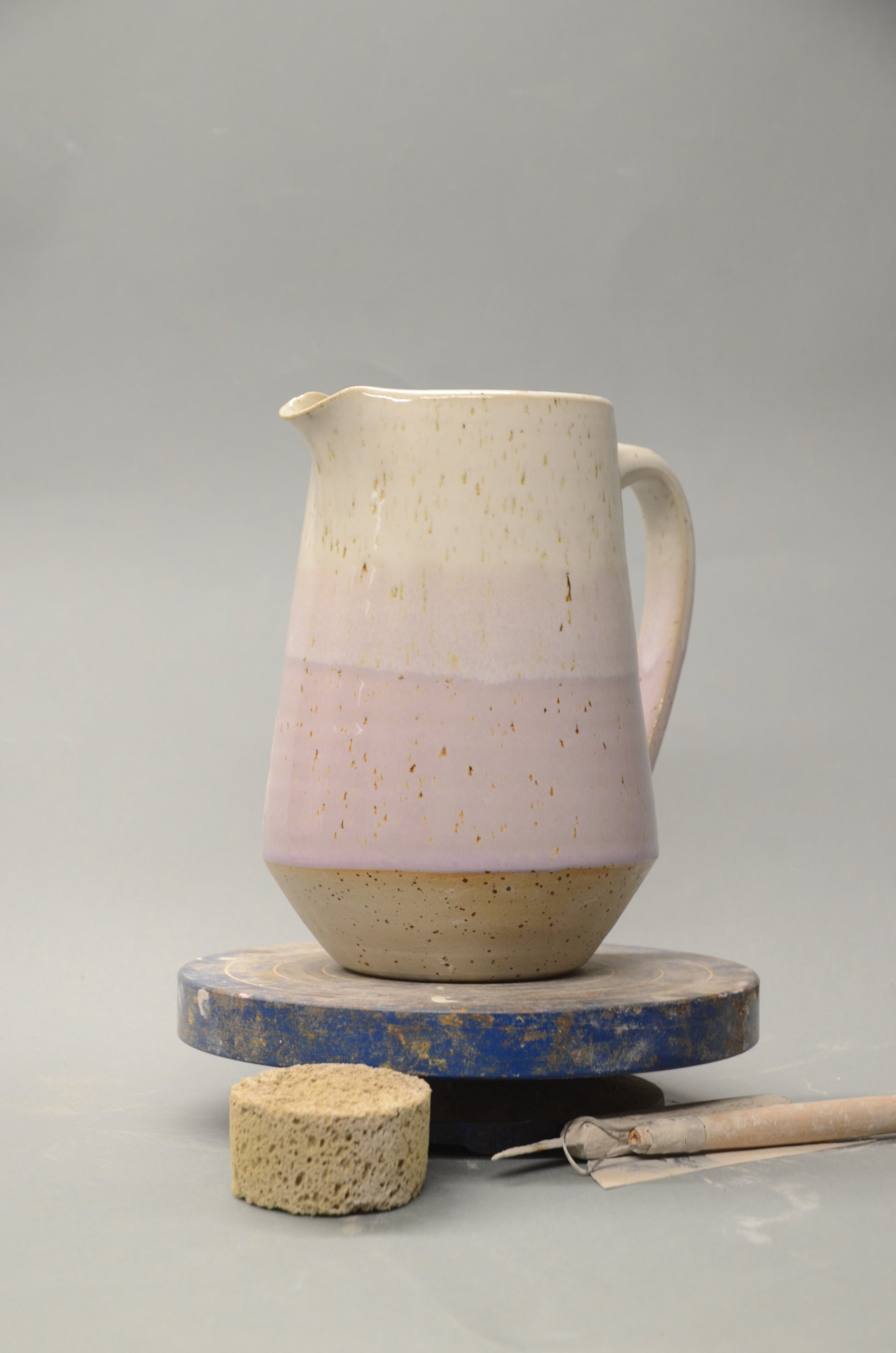 Diese Kanne wurde von mir per Hand an der Töpferscheibe gedreht und mit einem Ausgießer und einem handgezogenen Henkel versehen. Nach einem ersten Brand wurde sie sorgfältig glasiert und ein zweites Mal gebrannt.