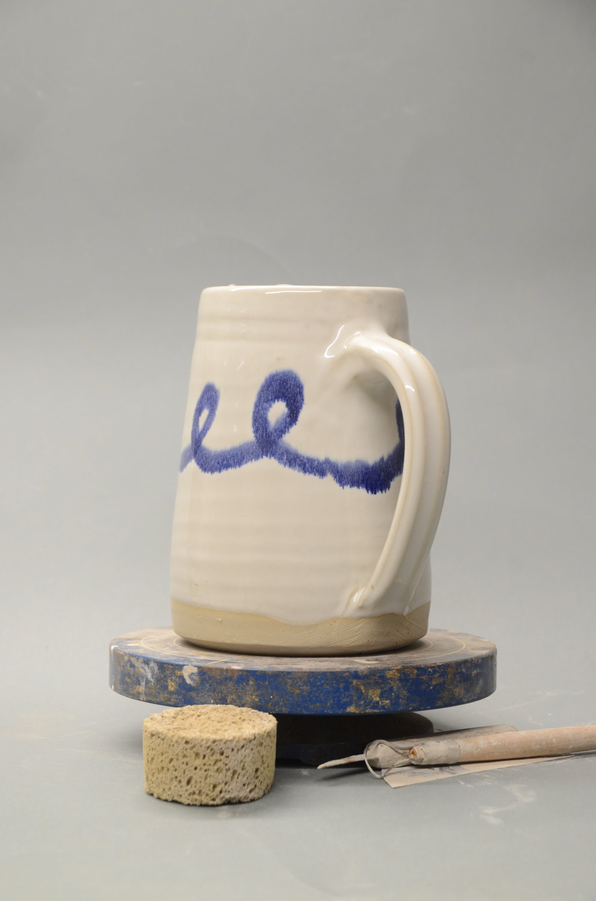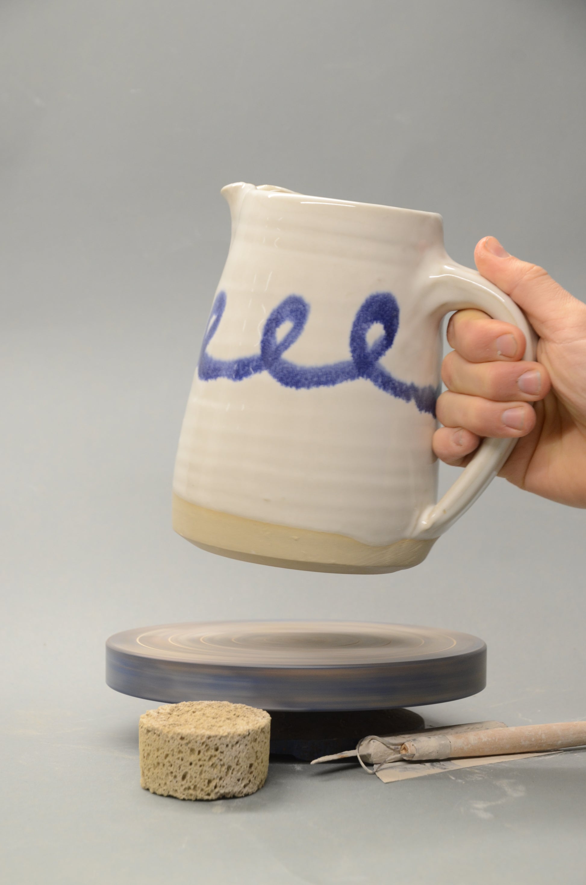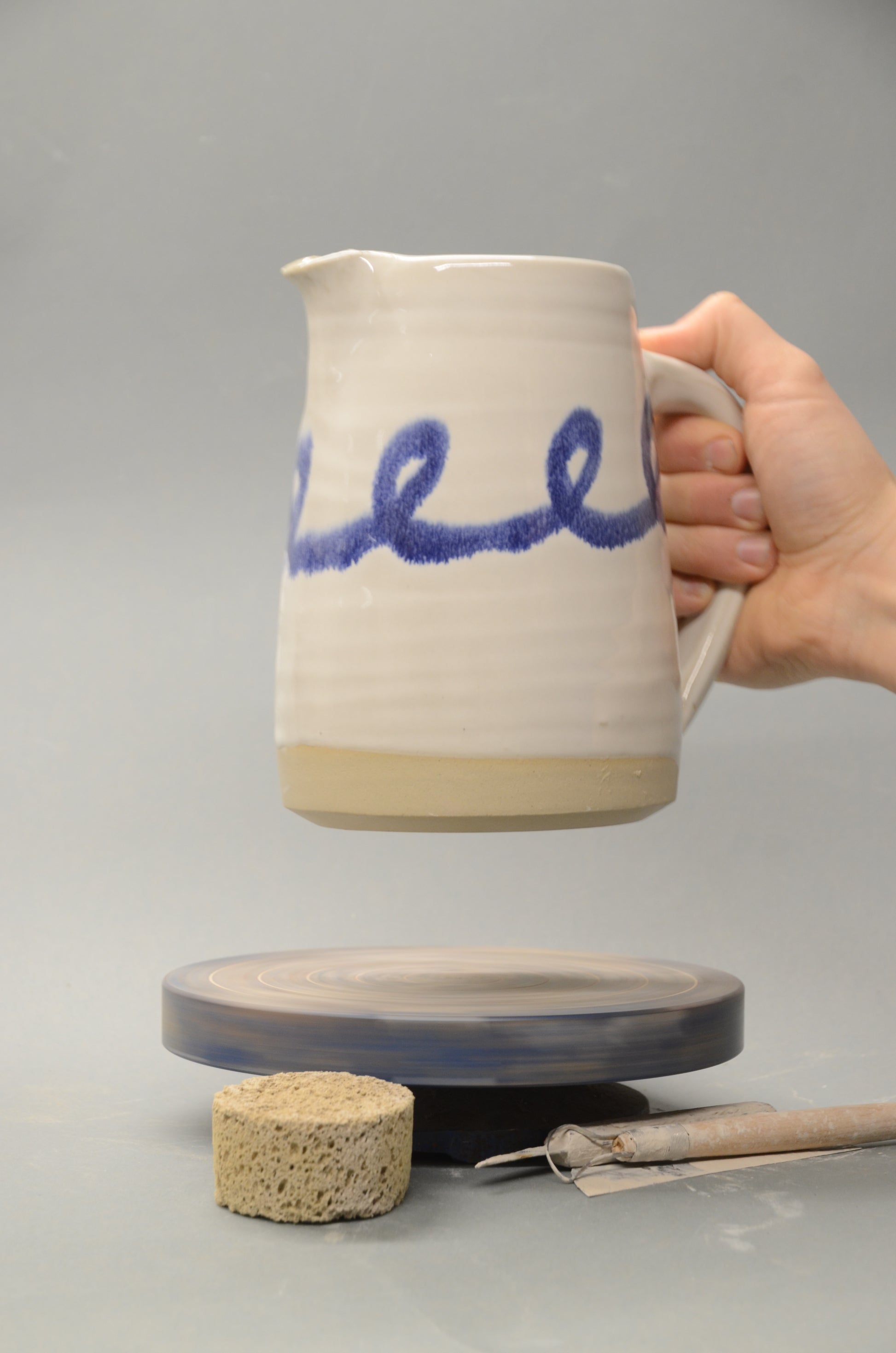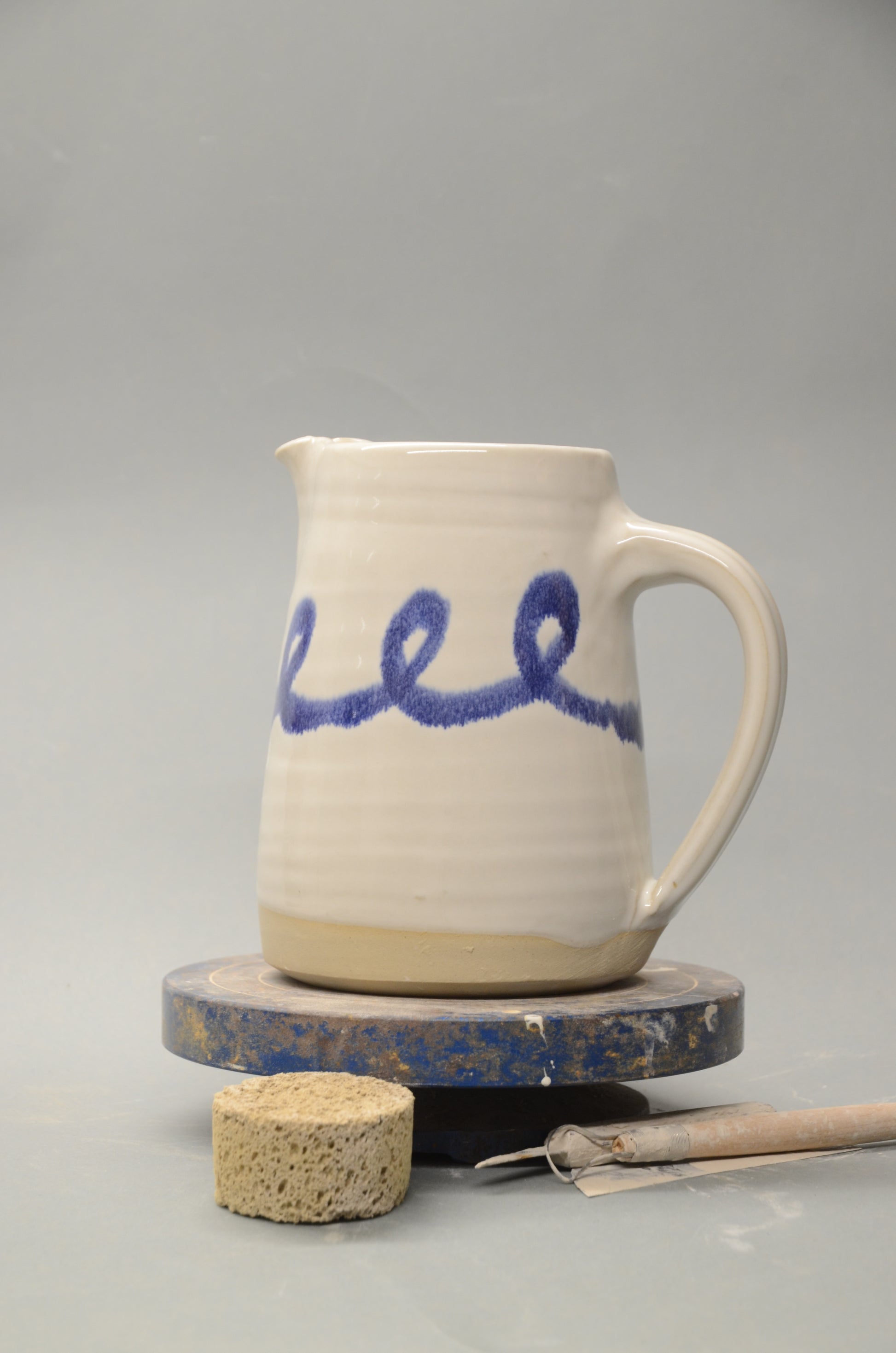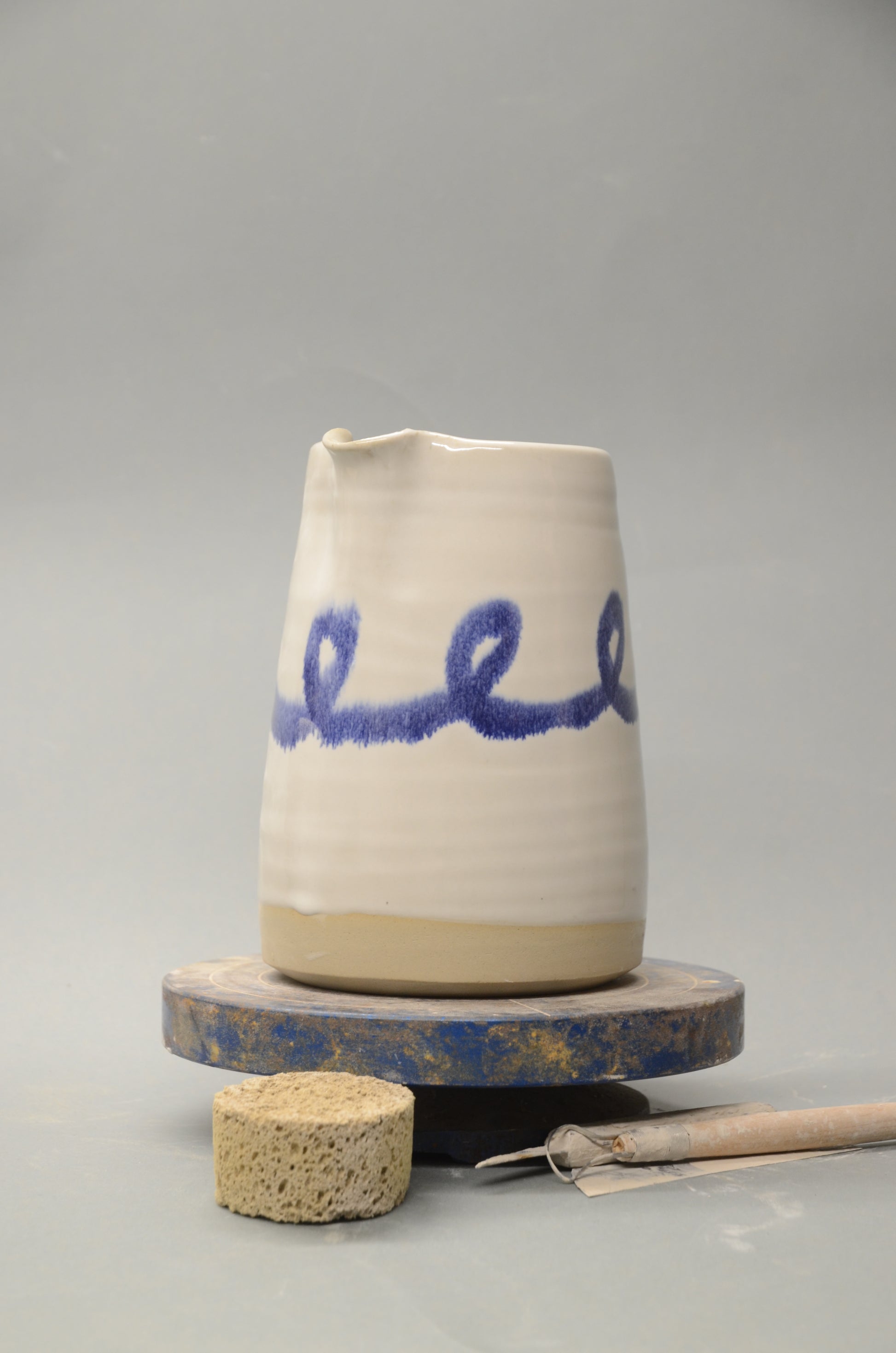 Diese Kanne wurde von mir per Hand an der Töpferscheibe gedreht und mit einem Ausgießer und einem handgezogenen Henkel versehen. Nach einem ersten Brand wurde sie sorgfältig glasiert und ein zweites Mal gebrannt.