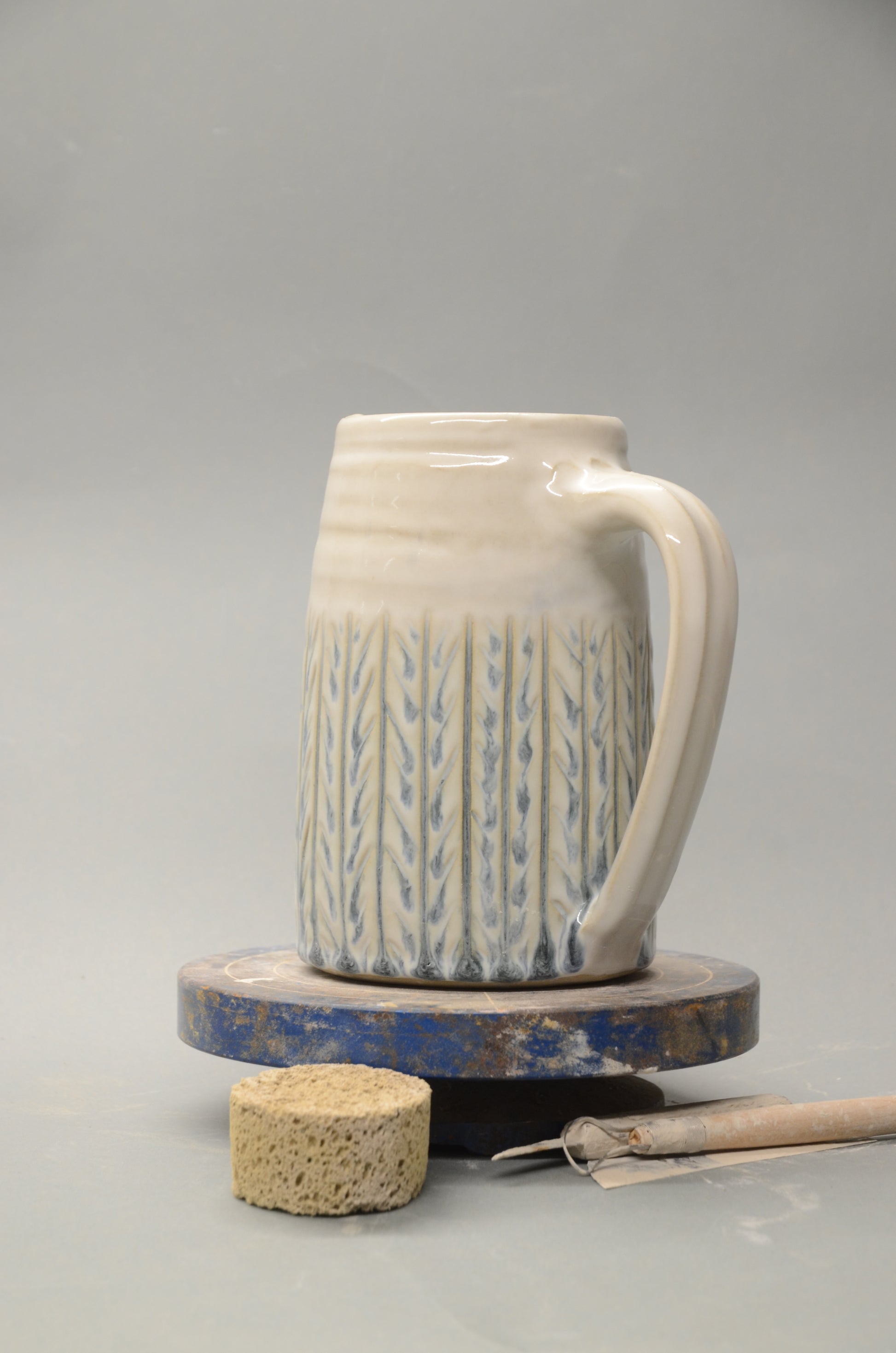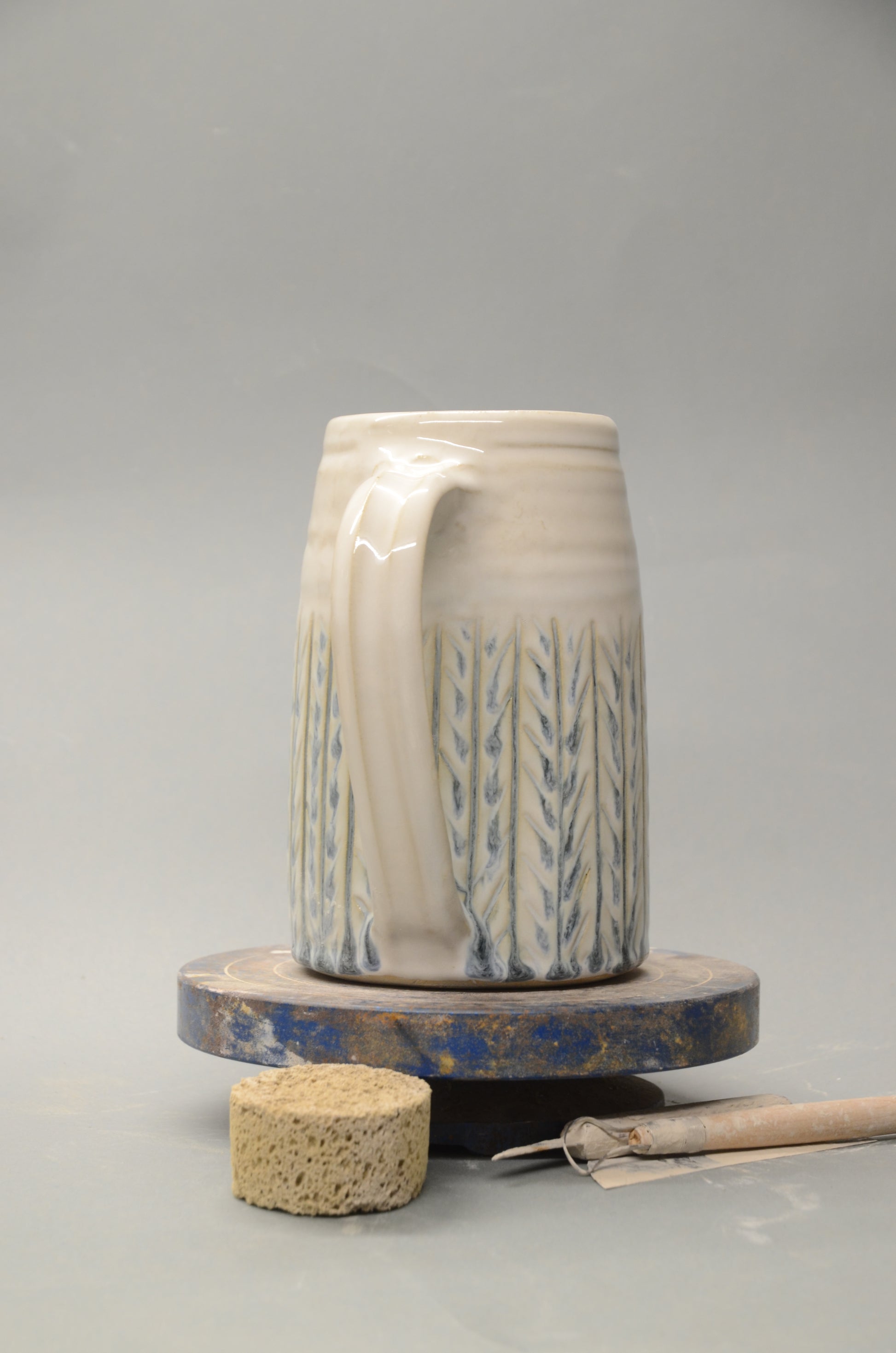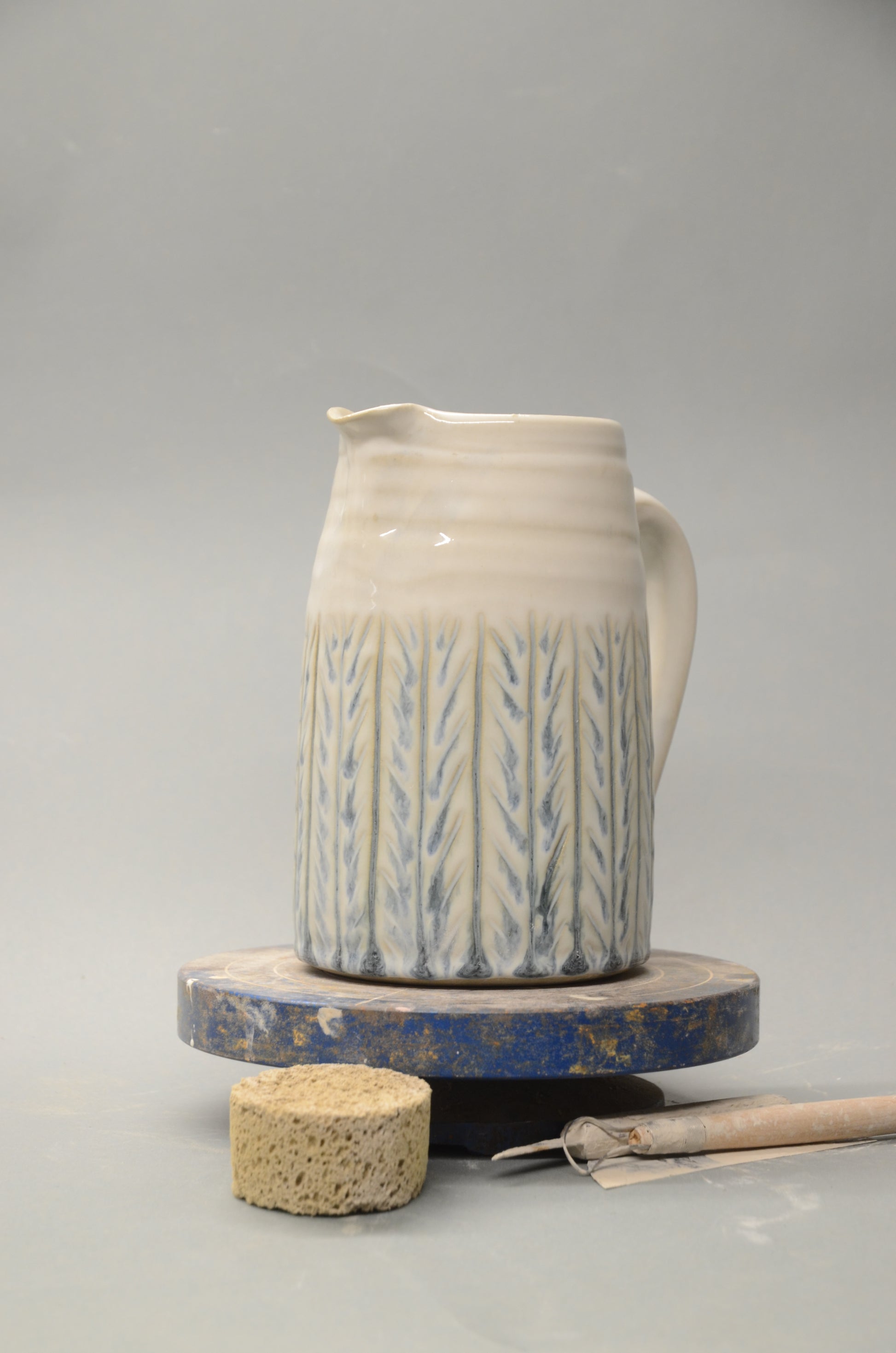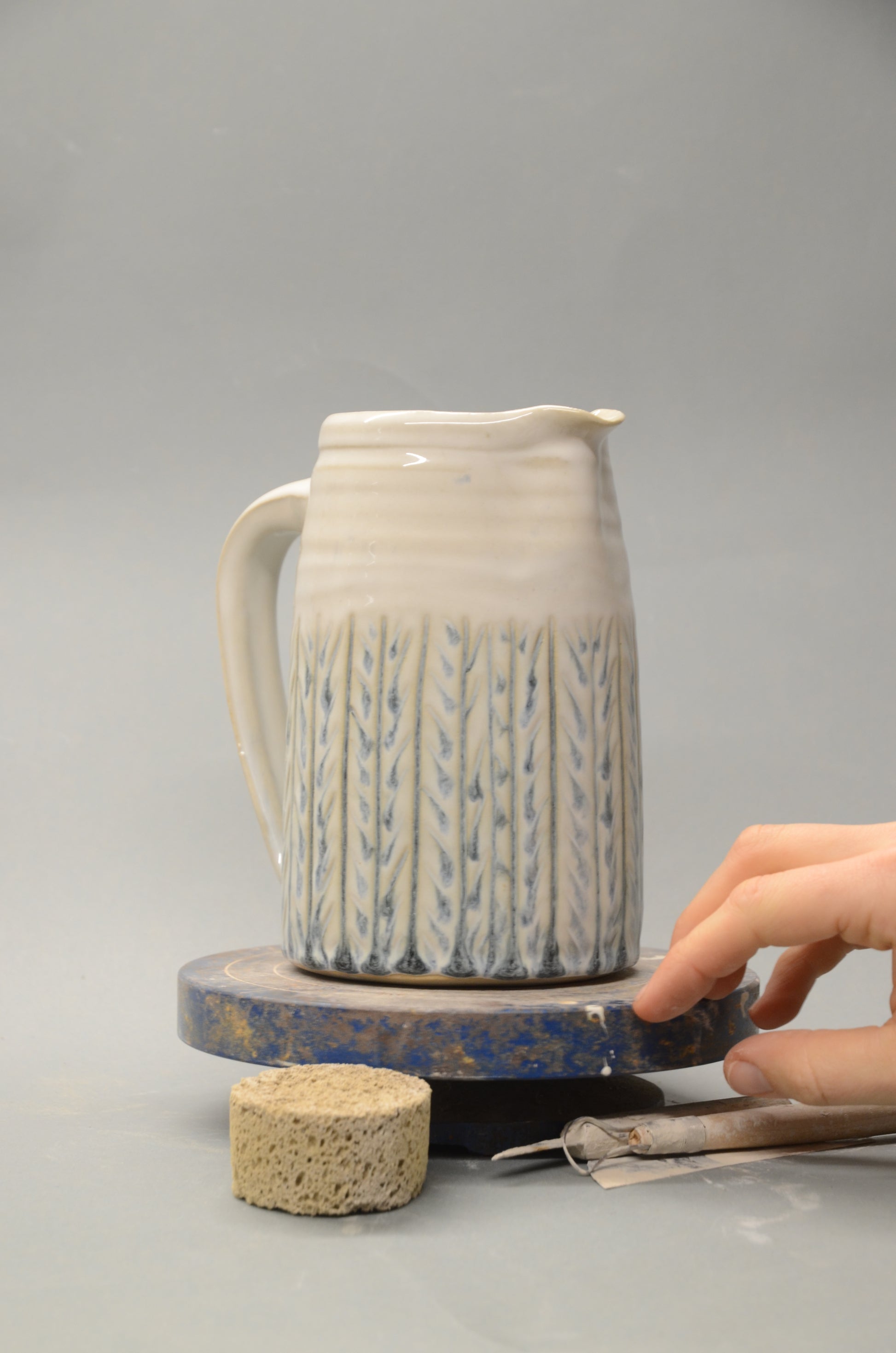 Diese Kanne wurde von mir per Hand an der Töpferscheibe gedreht und mit einem Ausgießer und einem handgezogenen Henkel versehen. Nach einem ersten Brand wurde sie sorgfältig glasiert und ein zweites Mal gebrannt.