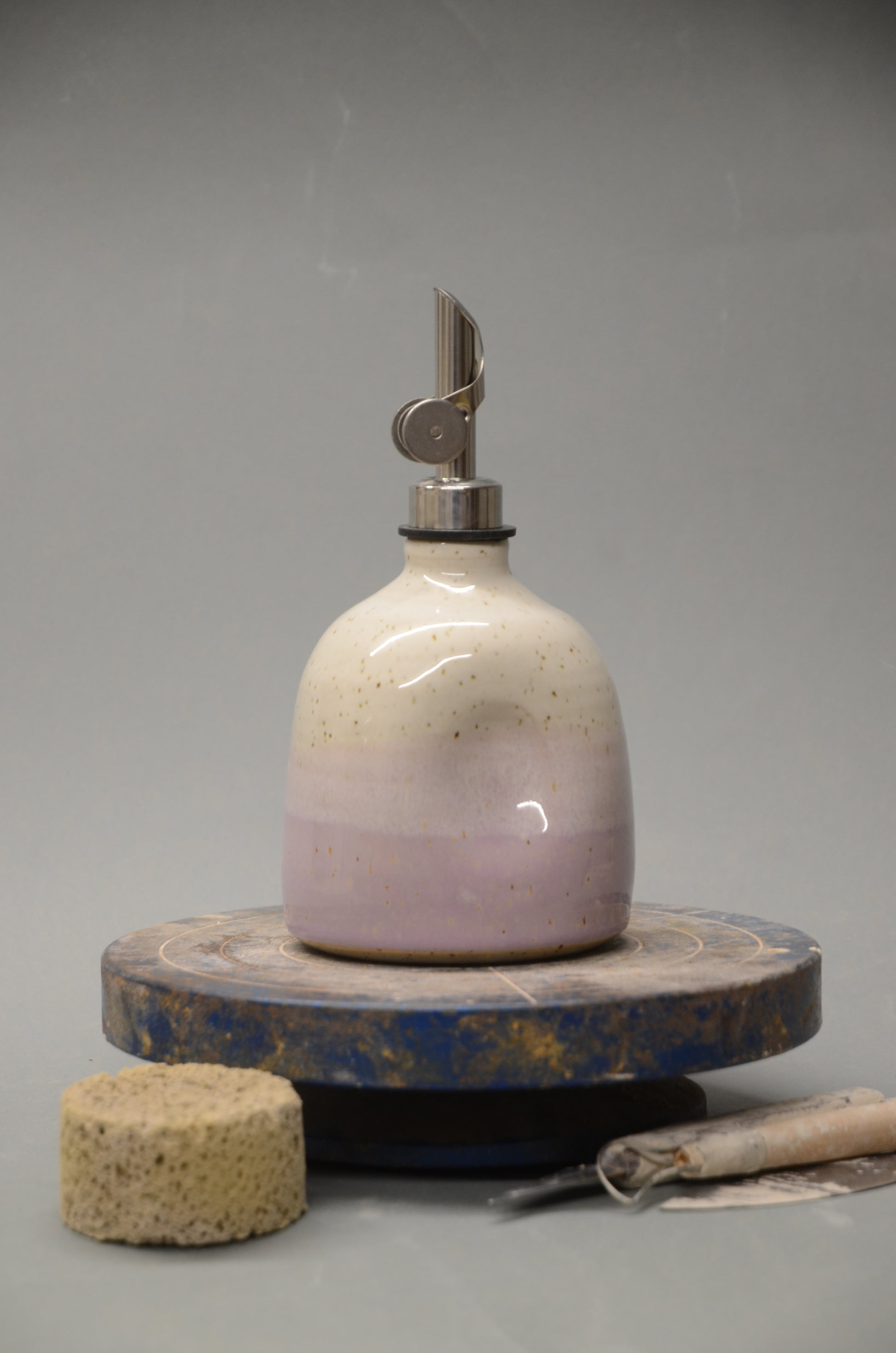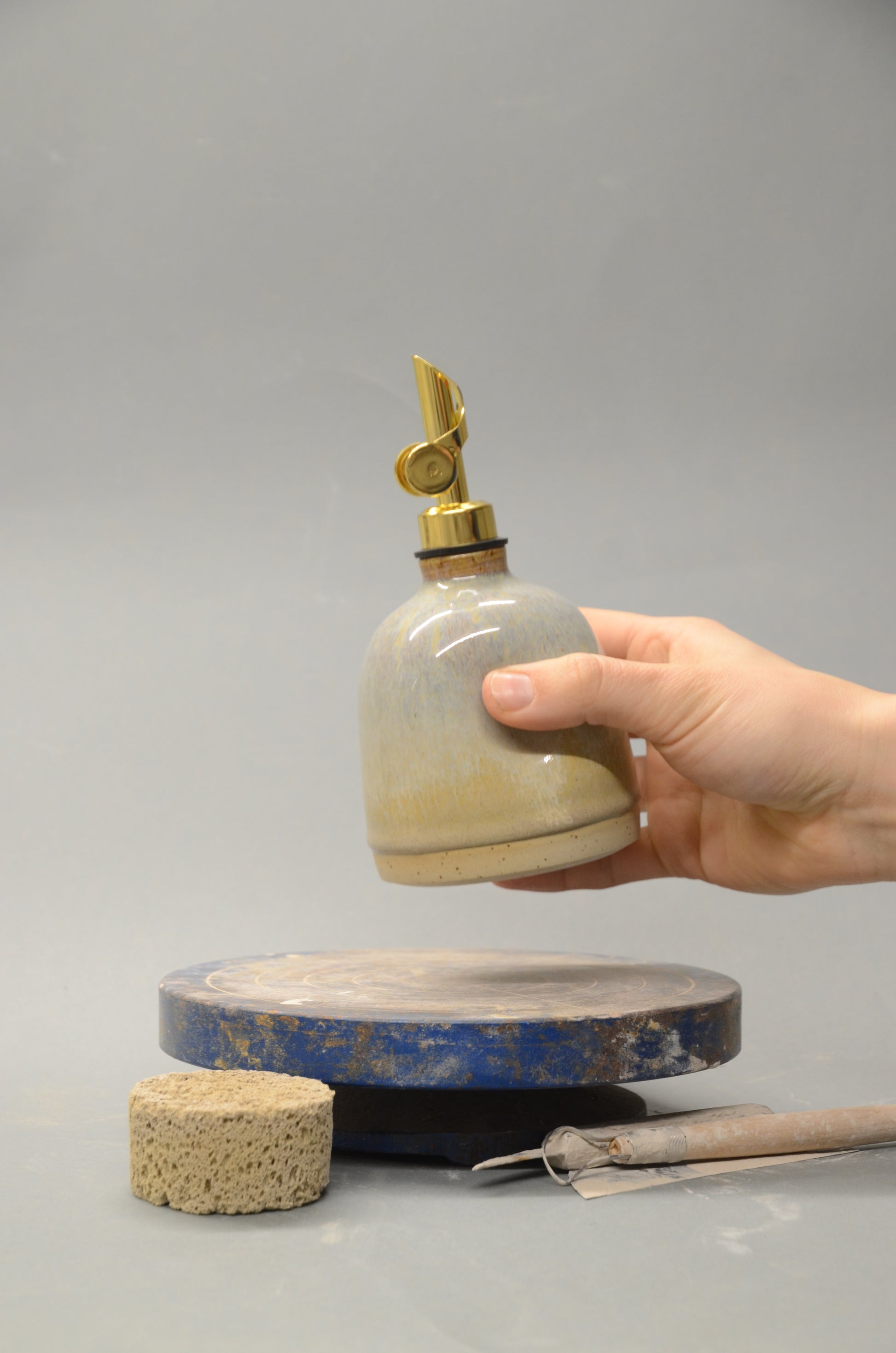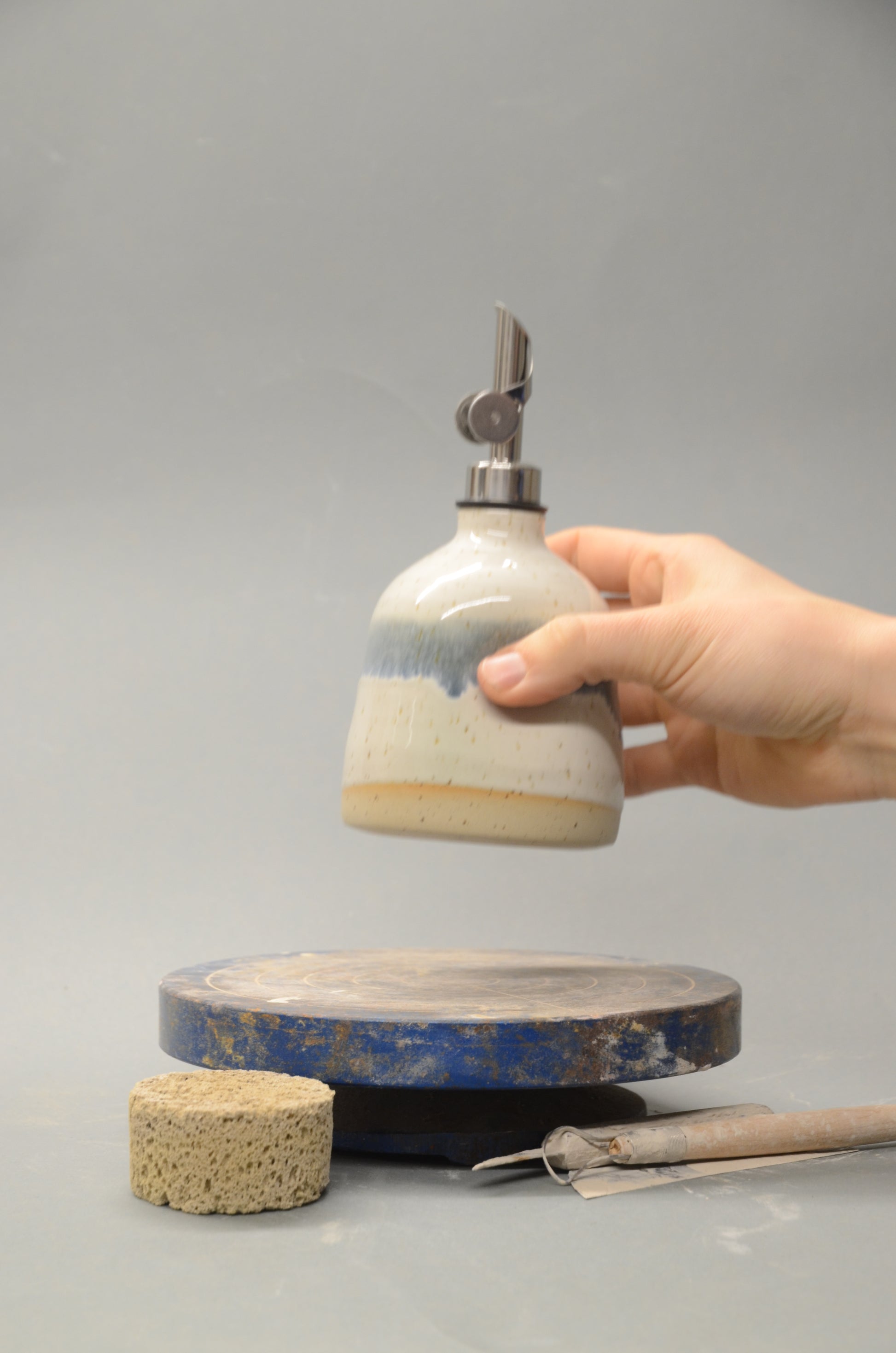 Diese Ölflasche wurde von mir per Hand an der Töpferscheibe aus Steinzeugton gedreht, abgedreht und nach einem ersten Brand sorgfältig glasiert und ein zweites Mal gebrannt.