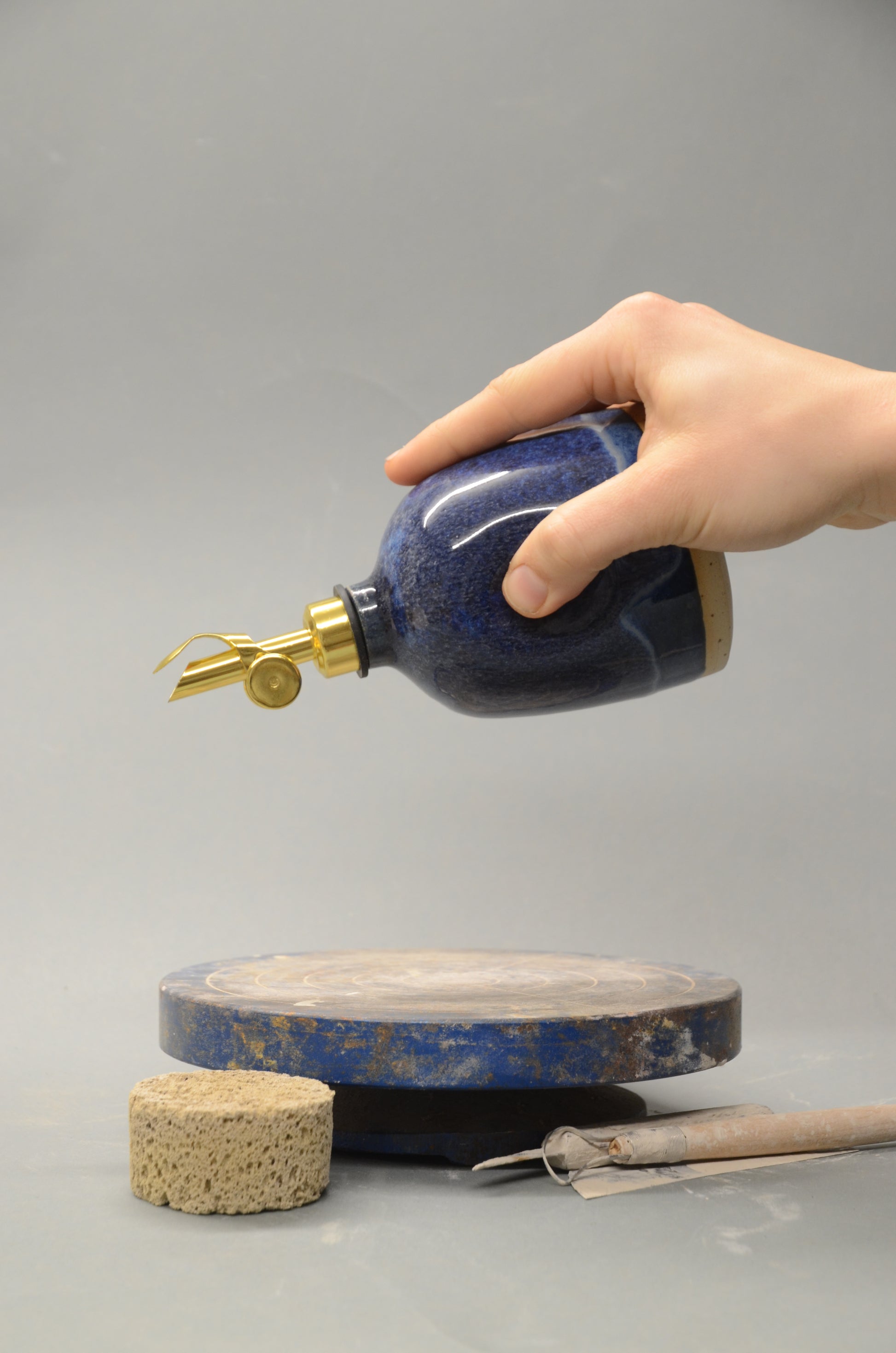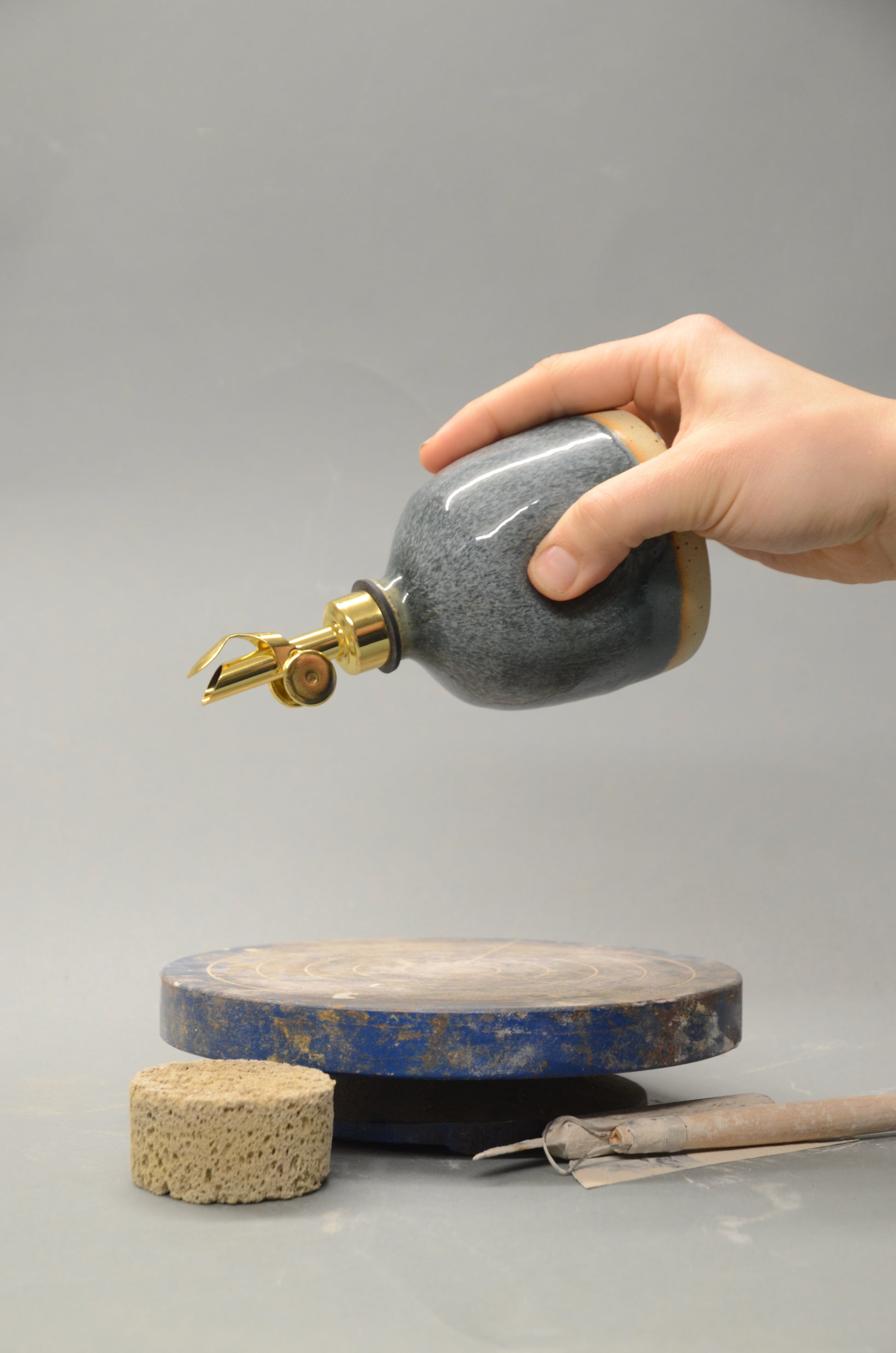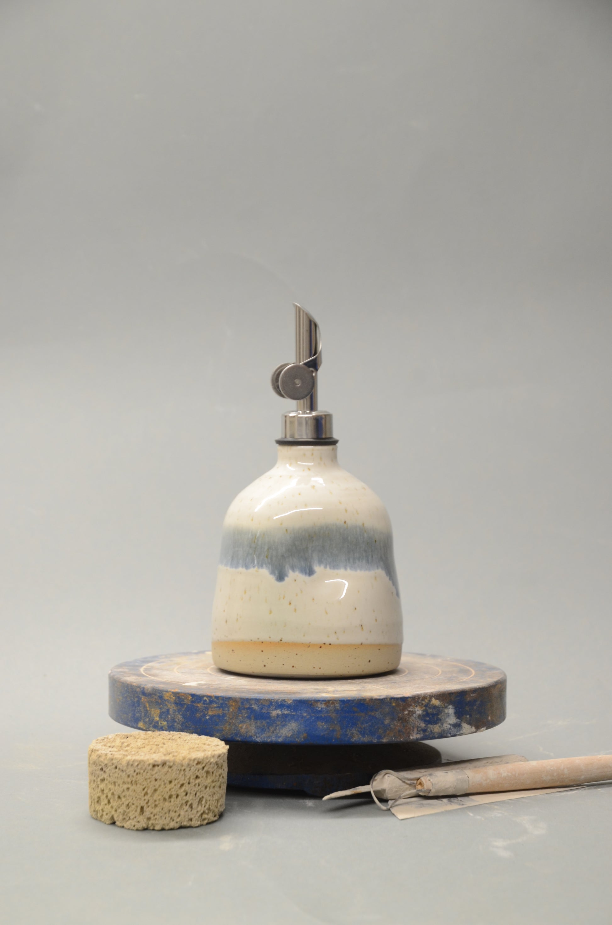 Diese Ölflasche wurde von mir per Hand an der Töpferscheibe aus Steinzeugton gedreht, abgedreht und nach einem ersten Brand sorgfältig glasiert und ein zweites Mal gebrannt.
