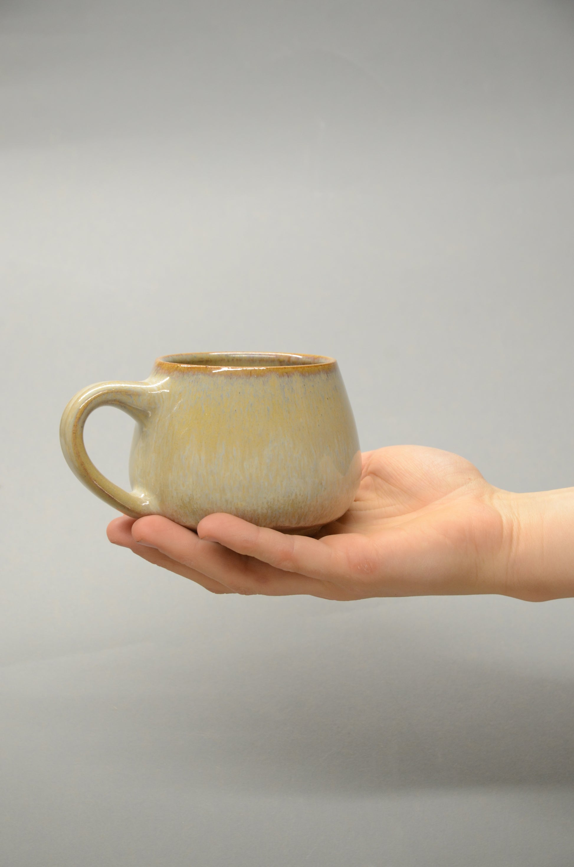 Diese Tasse wurde von mir per Hand an der Töpferscheibe gedreht und nach dem Abdrehen mit einem handgezogenen Henkel versehen.