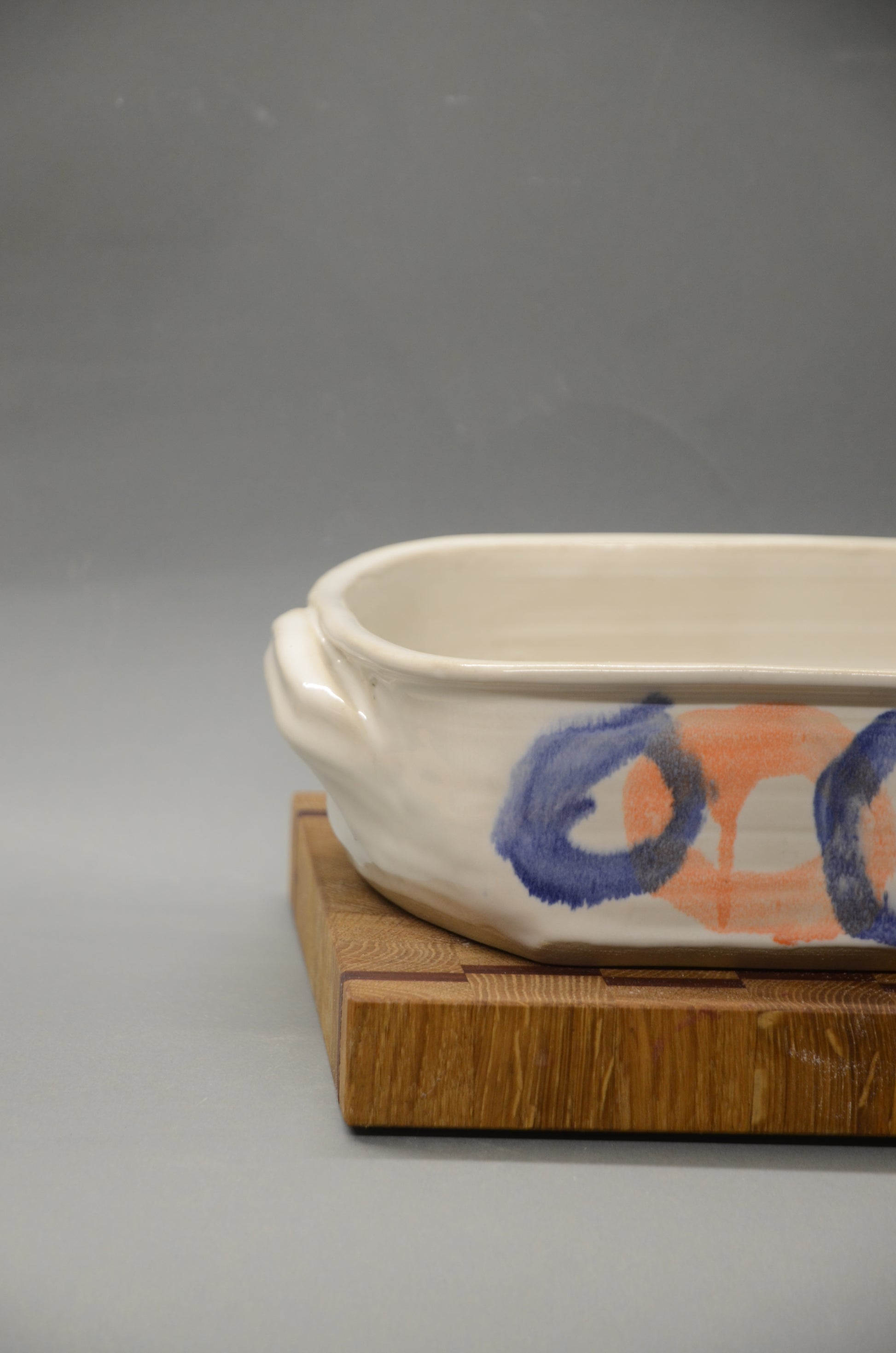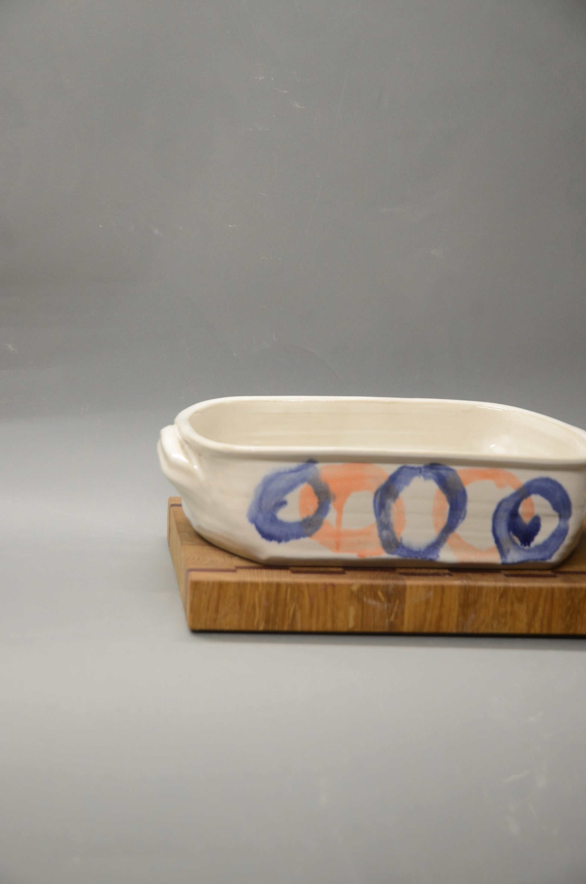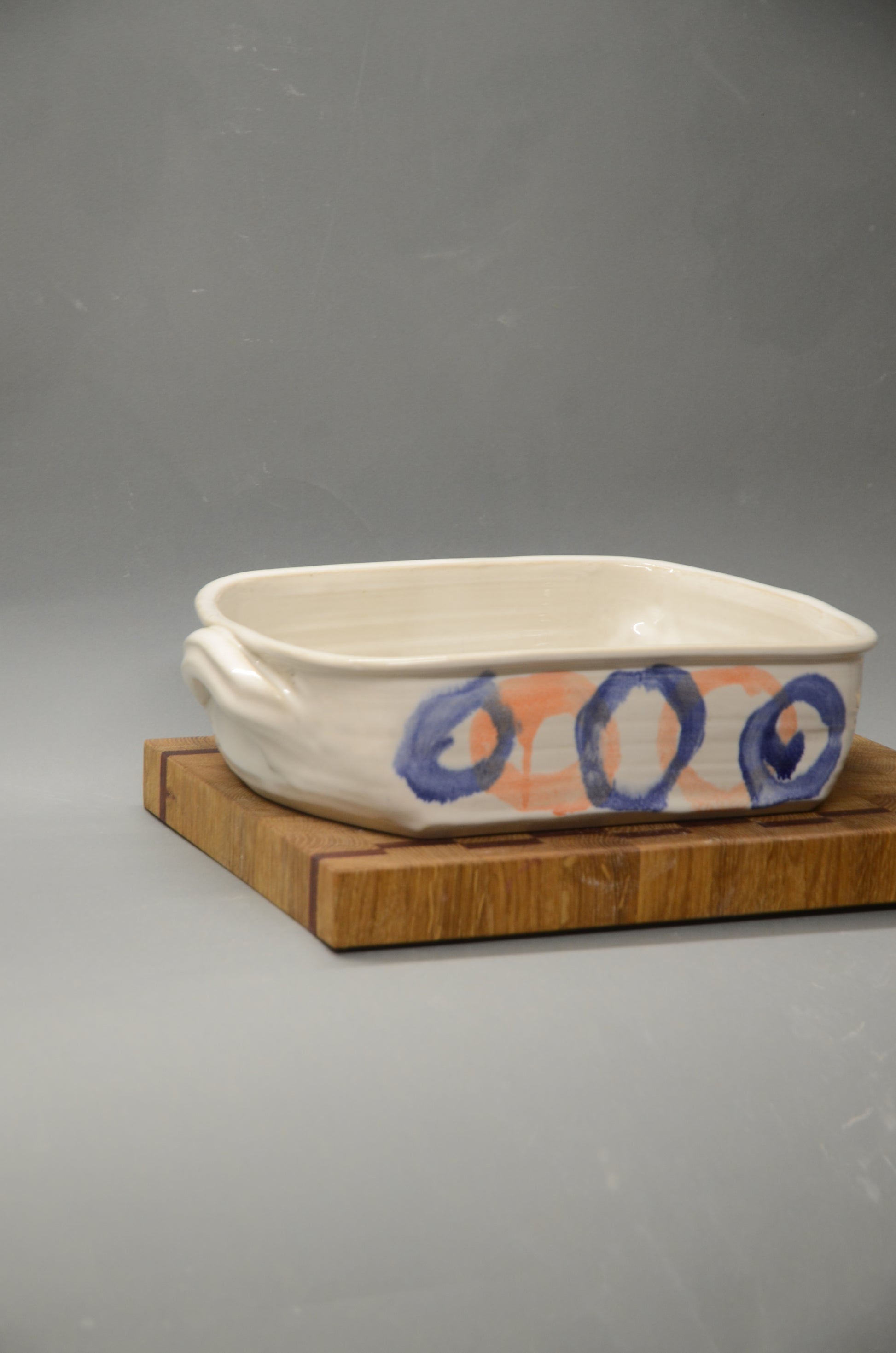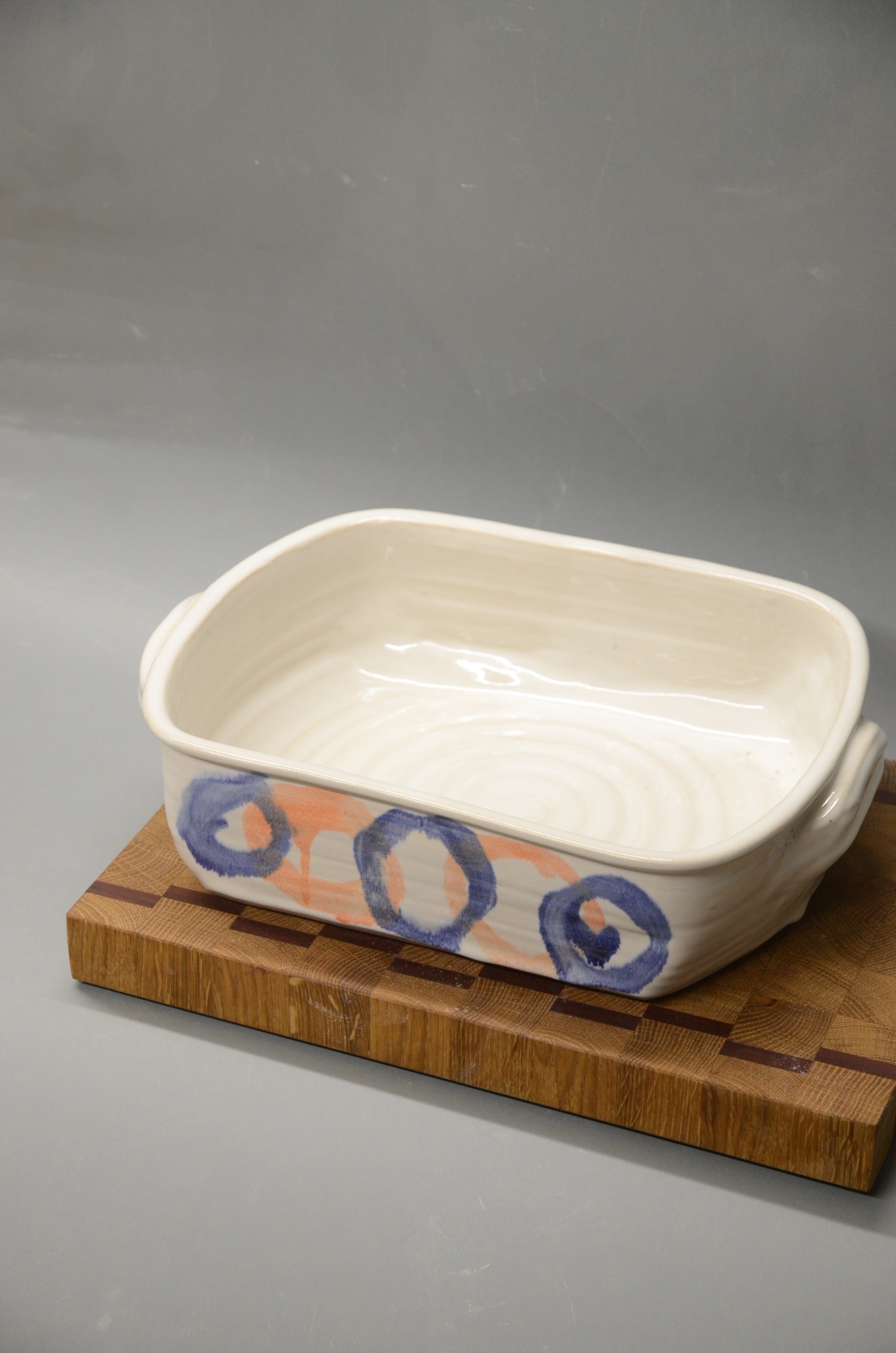 Diese Auflaufform wurde von mir per Hand an der Töpferscheibe aus Steinzeugton gedreht, in ihre eckige Form geformt und nach einem ersten Brand sorgfältig glasiert und ein zweites Mal gebrannt.