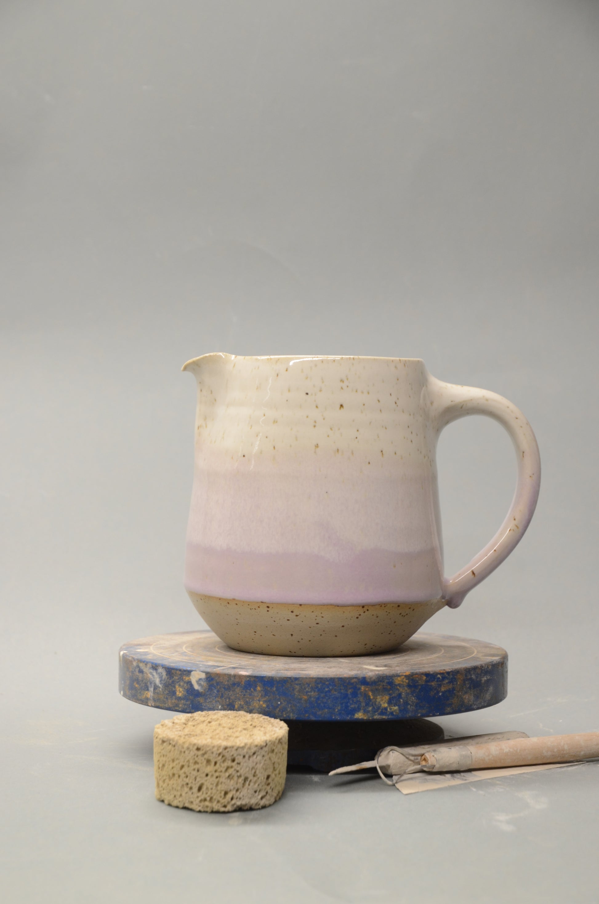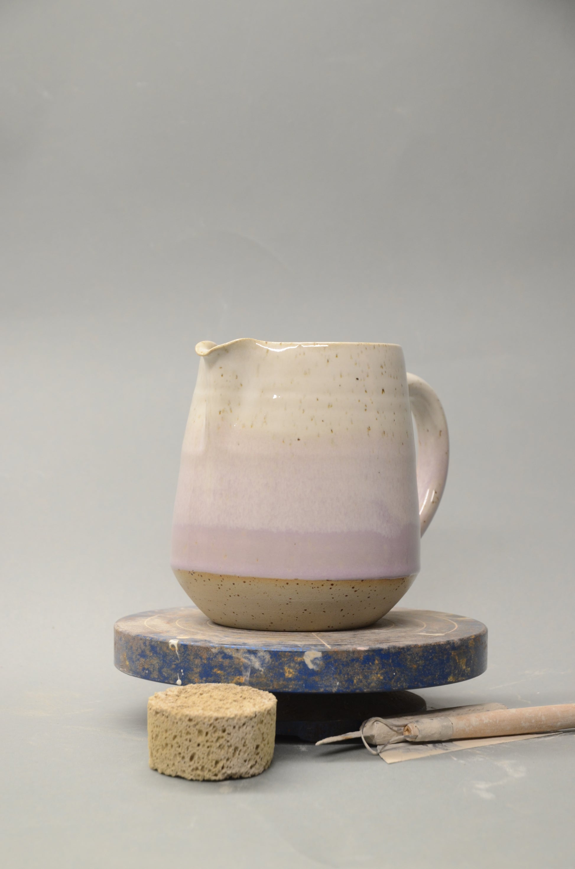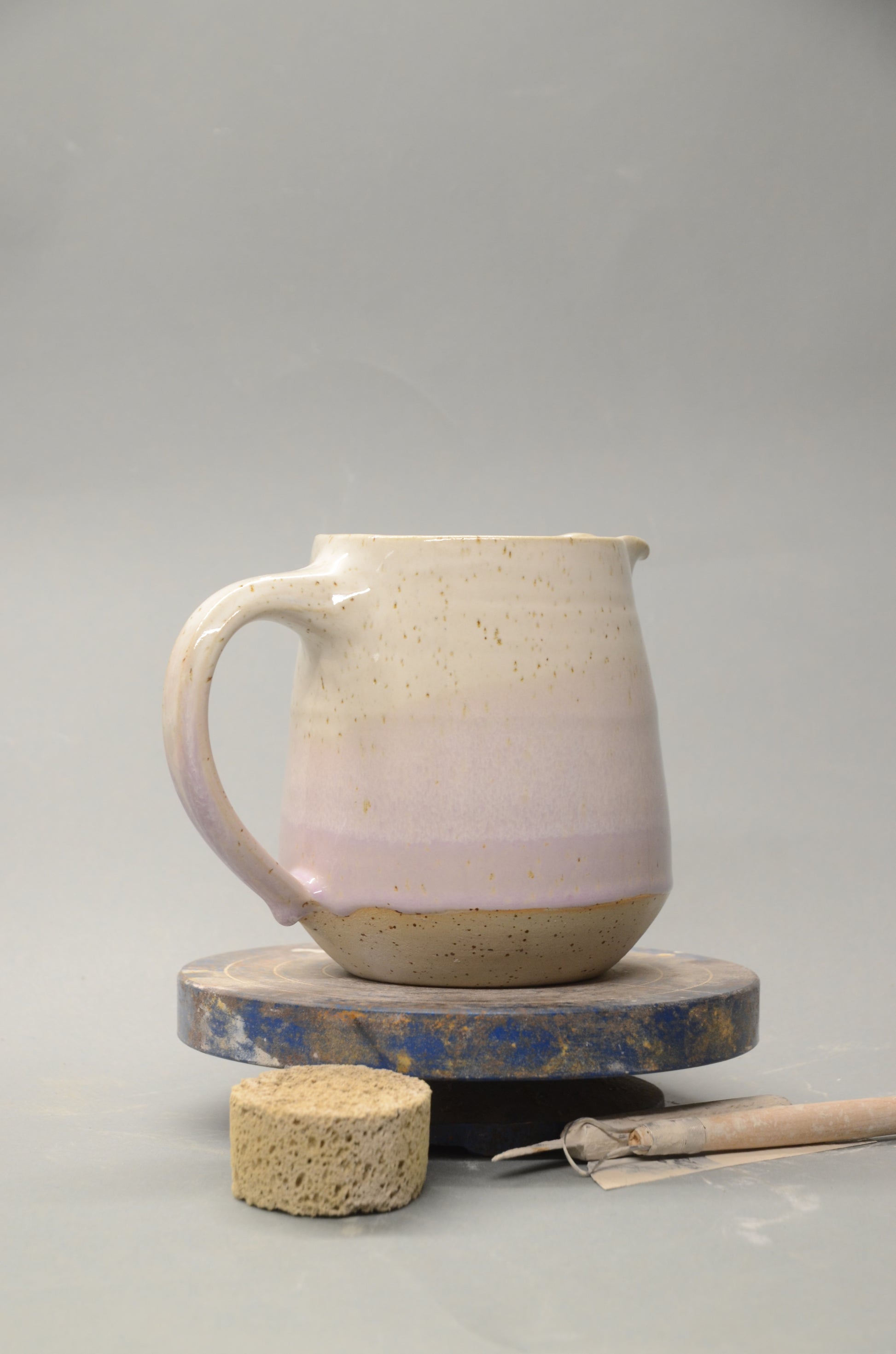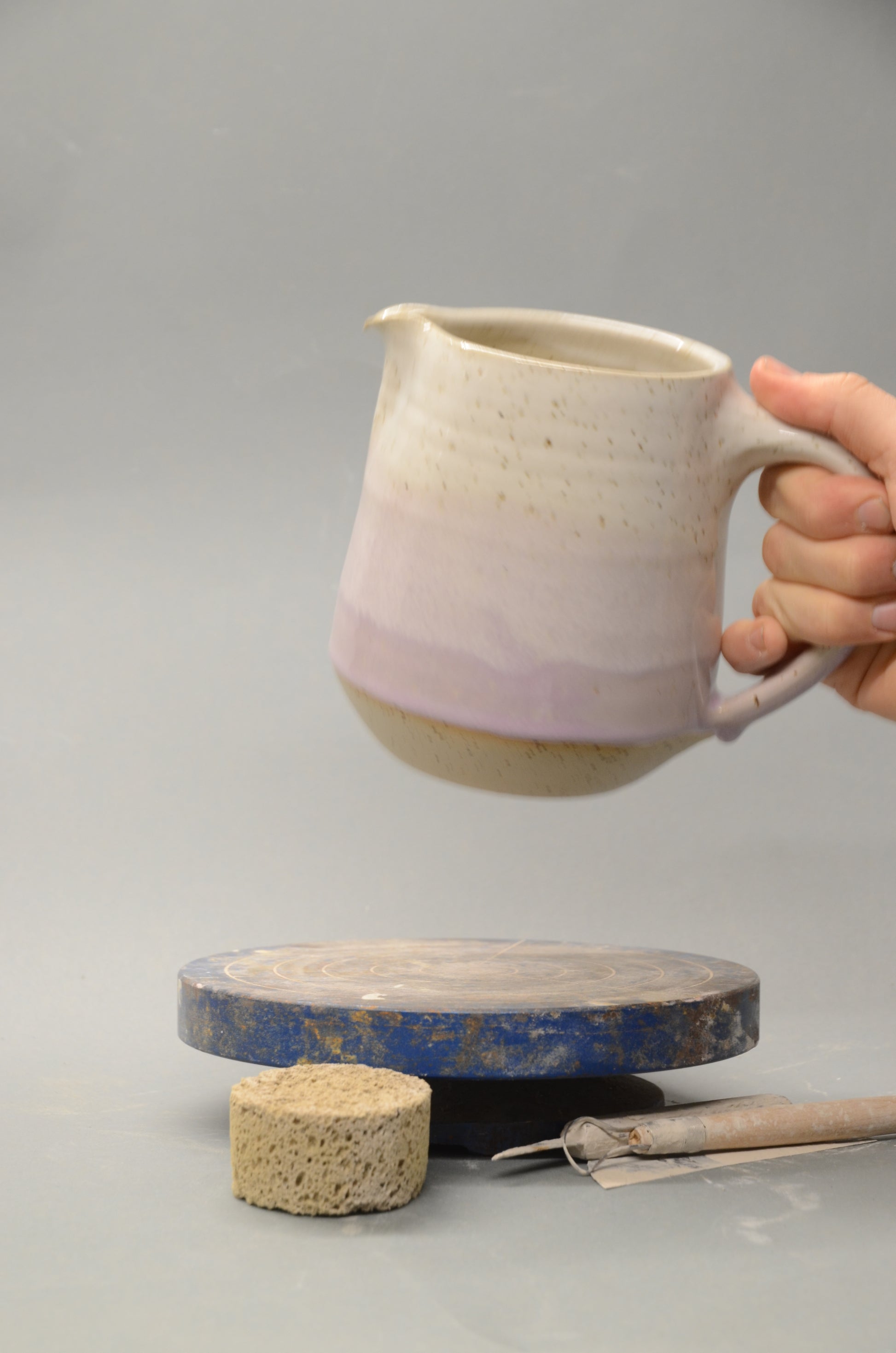 Diese Kanne wurde von mir per Hand an der Töpferscheibe gedreht und mit einem Ausgießer und einem handgezogenen Henkel versehen. Nach einem ersten Brand wurde sie sorgfältig glasiert und ein zweites Mal gebrannt.