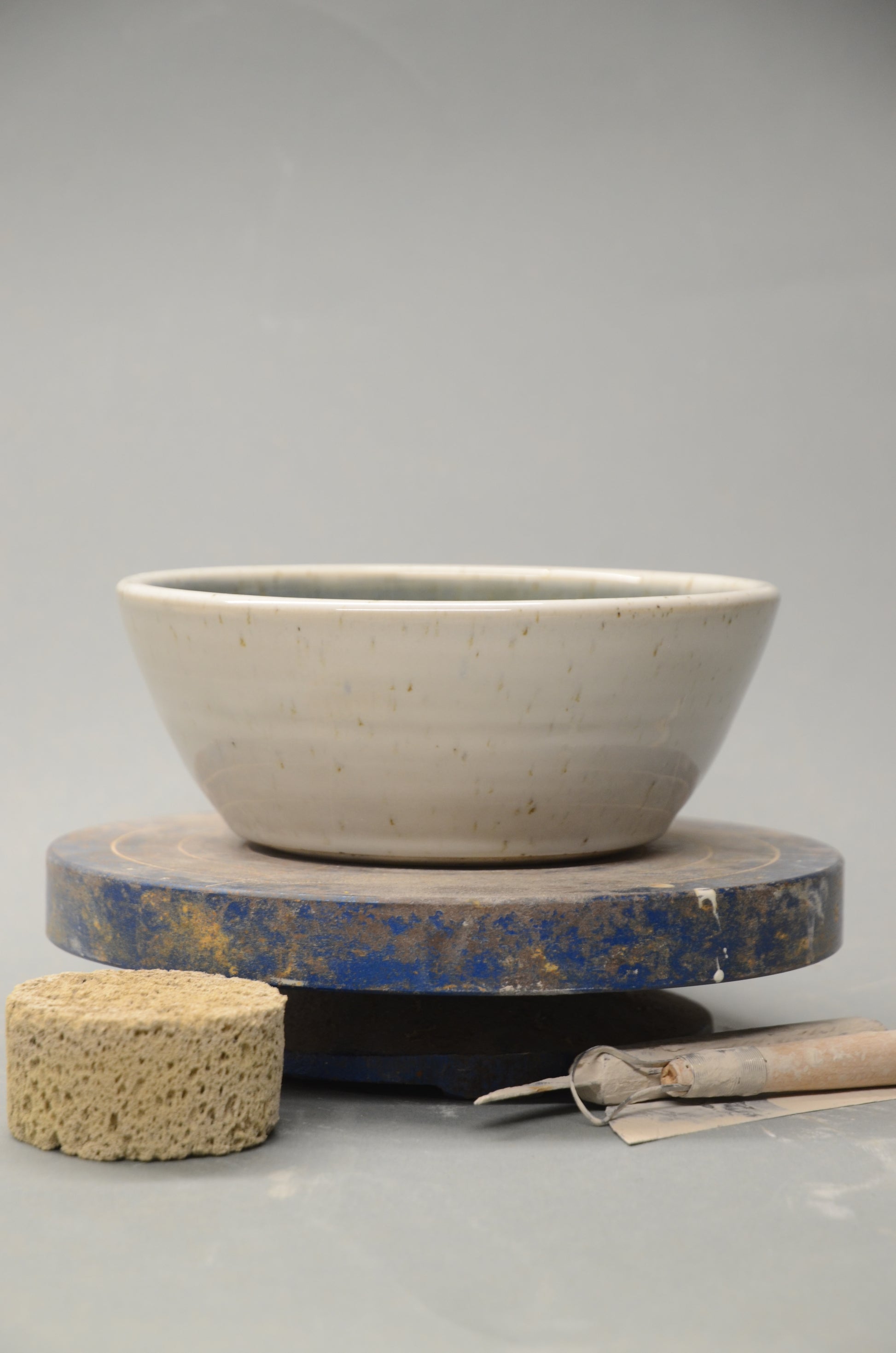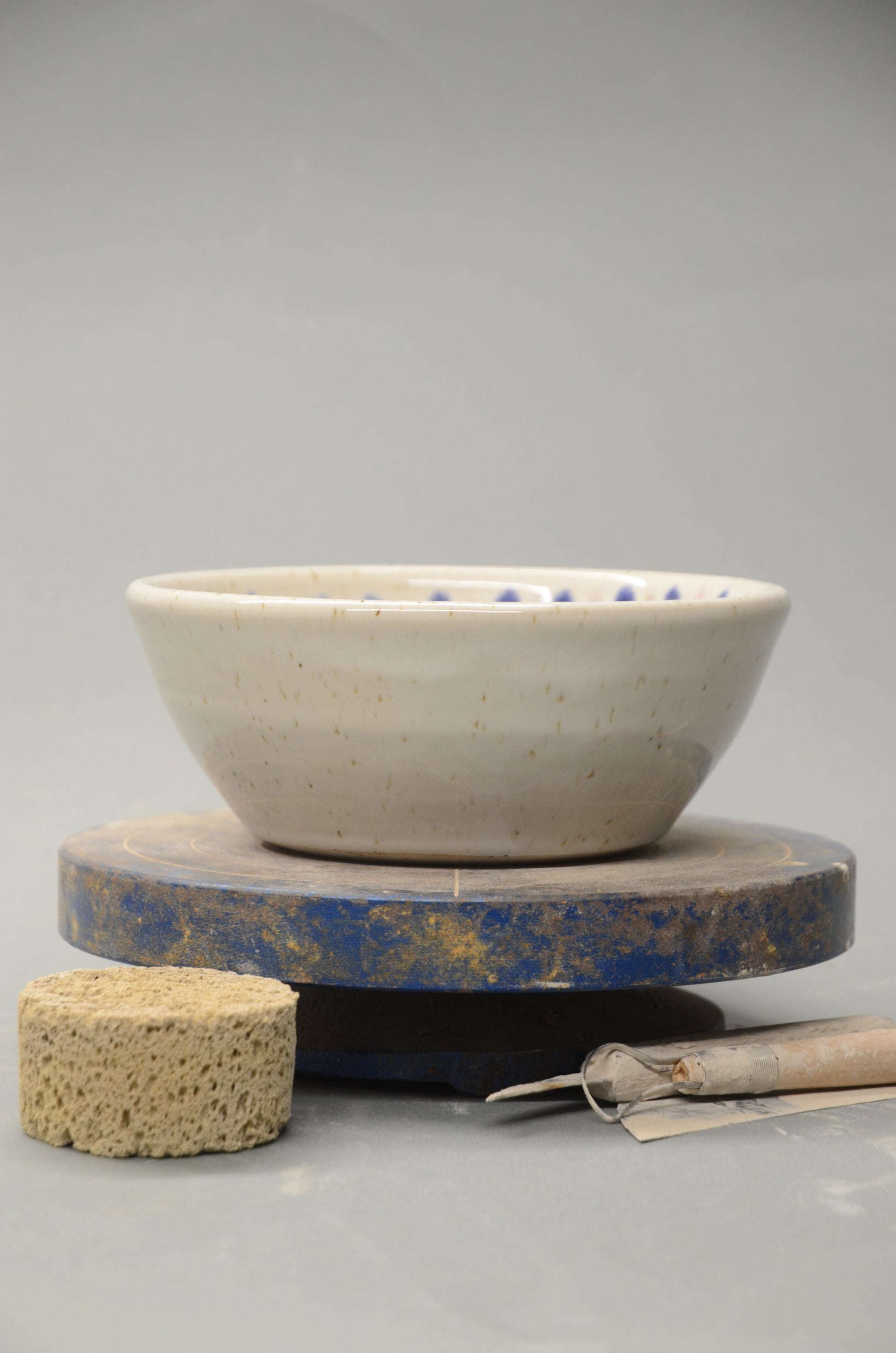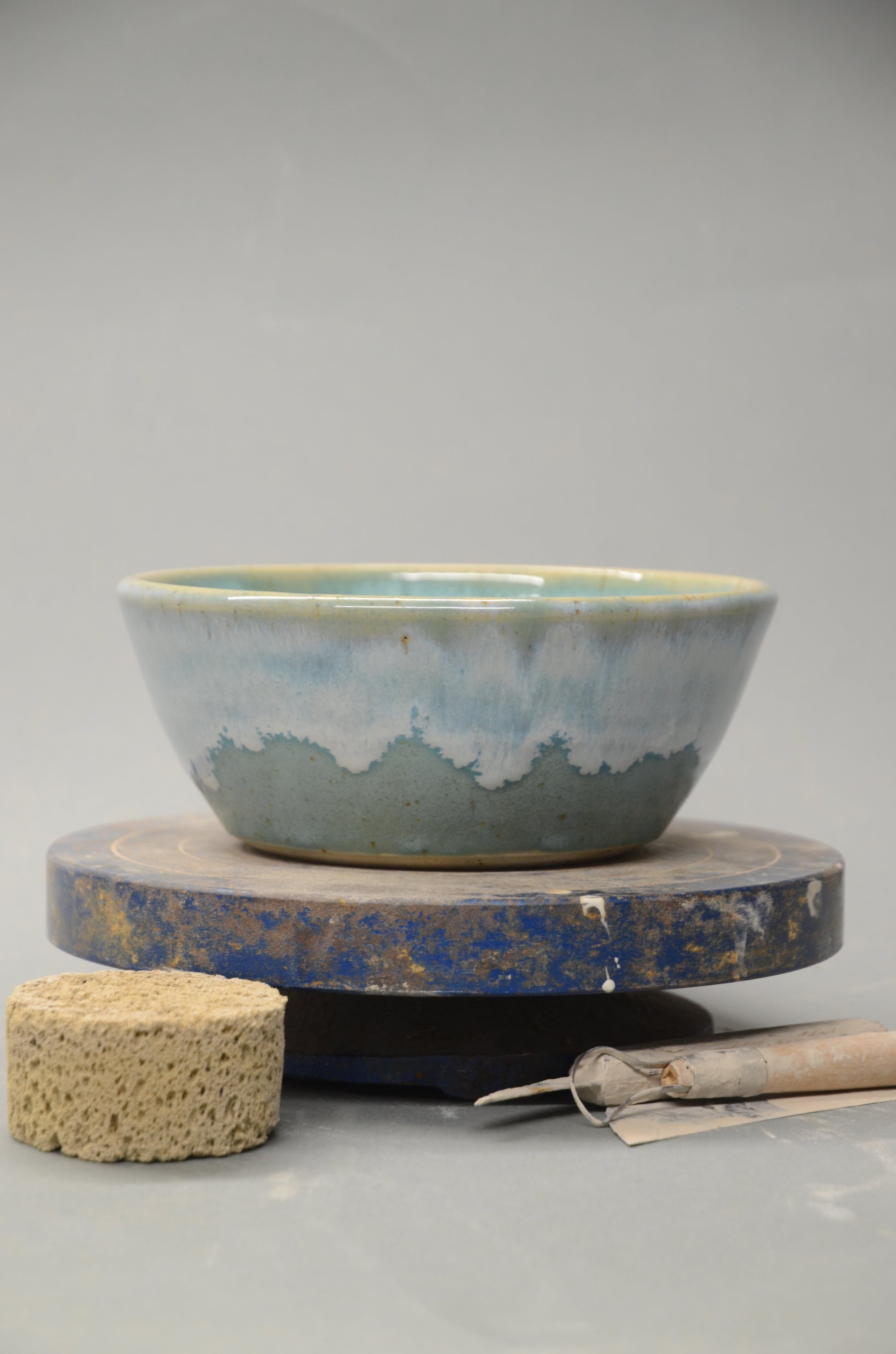 Diese Schale wurde von mir per Hand an der Töpferscheibe aus Steinzeugton gedreht, abgedreht und nach einem ersten Brand sorgfältig glasiert und ein zweites Mal gebrannt.