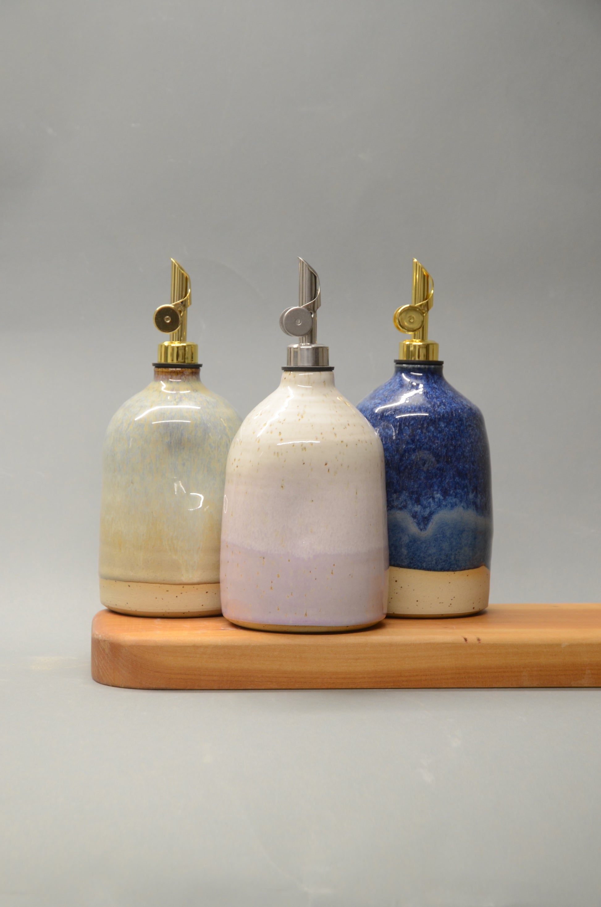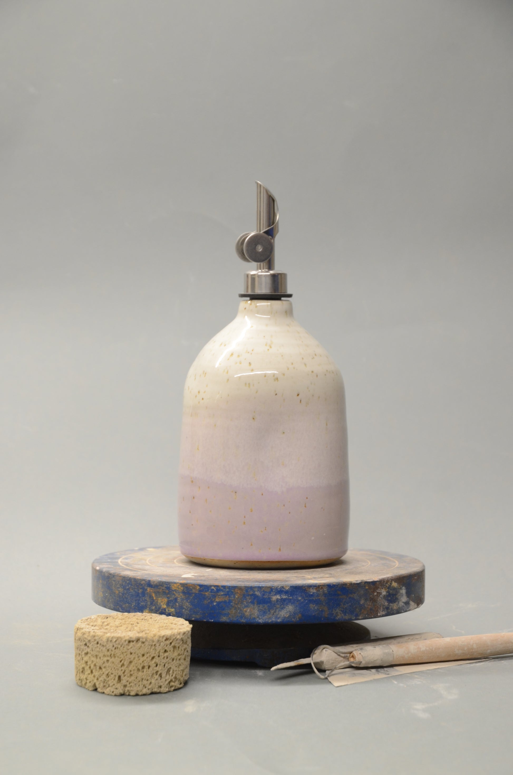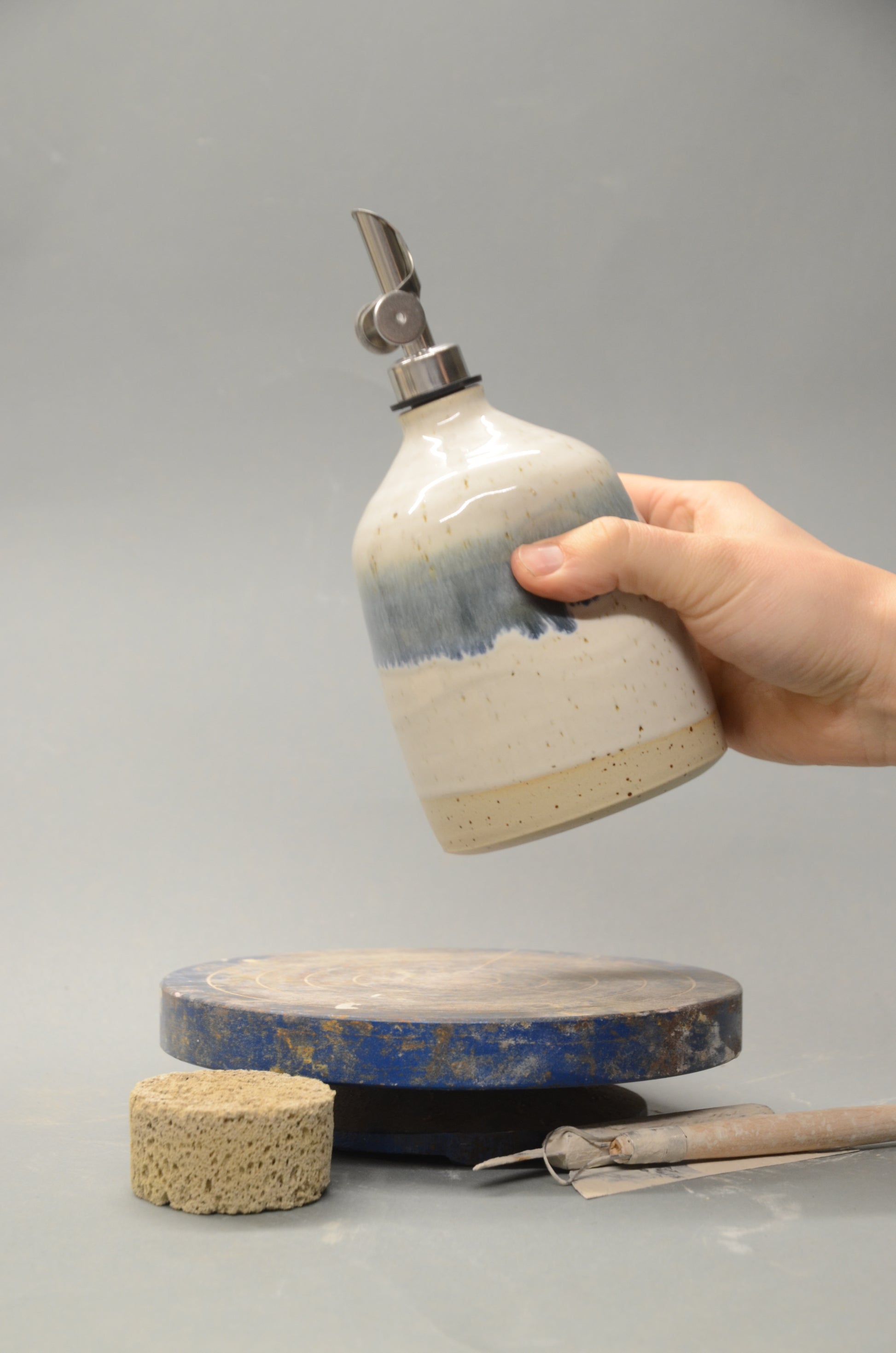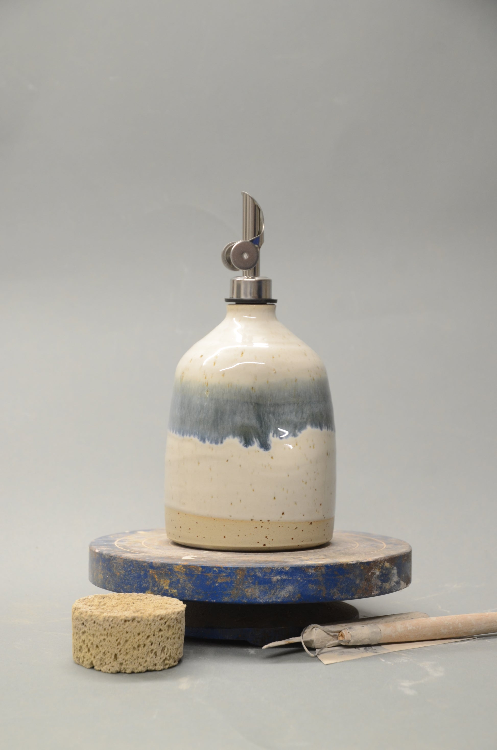 Diese Ölflasche wurde von mir per Hand an der Töpferscheibe aus Steinzeugton gedreht, abgedreht und nach einem ersten Brand sorgfältig glasiert und ein zweites Mal gebrannt.
