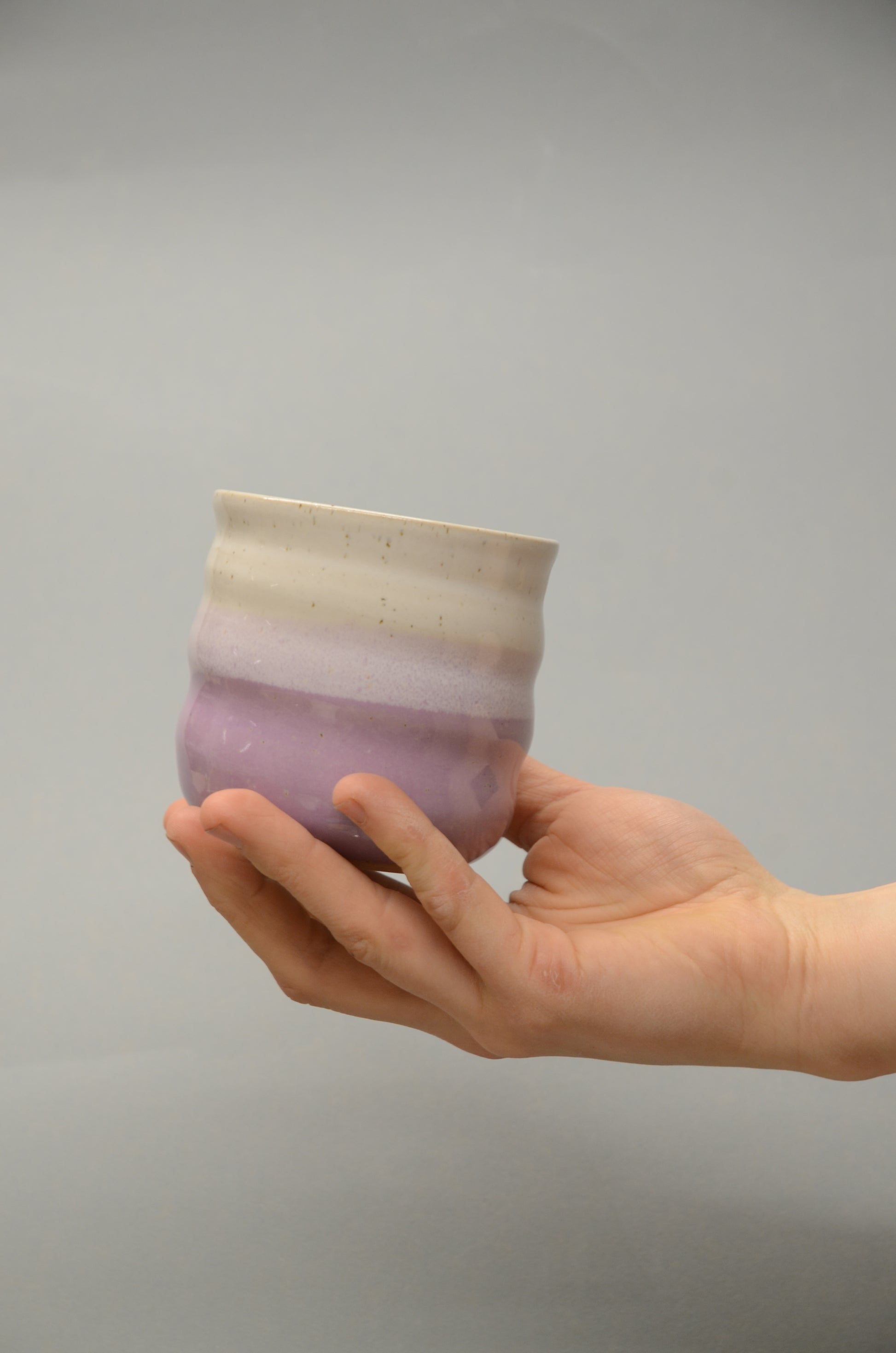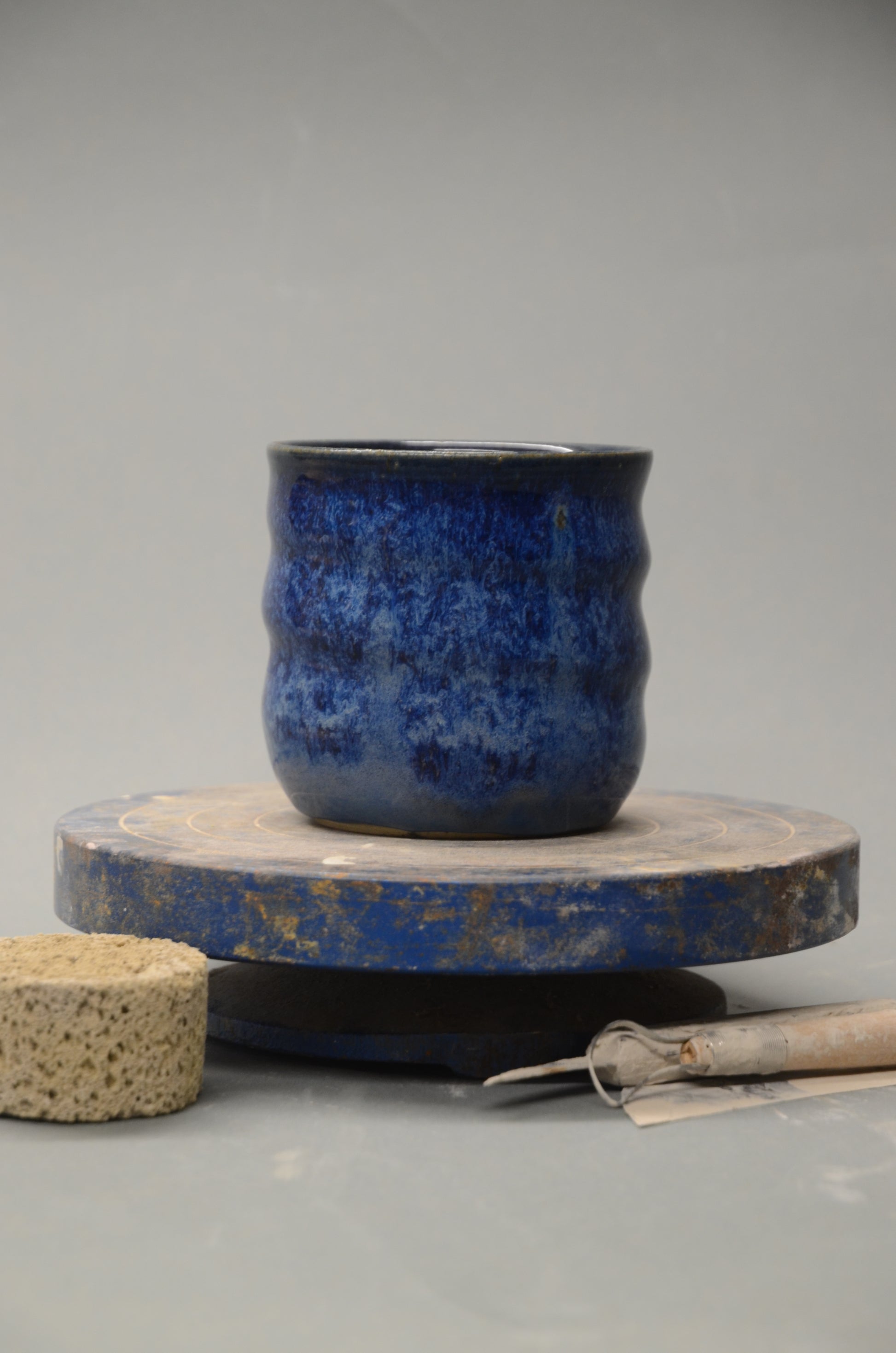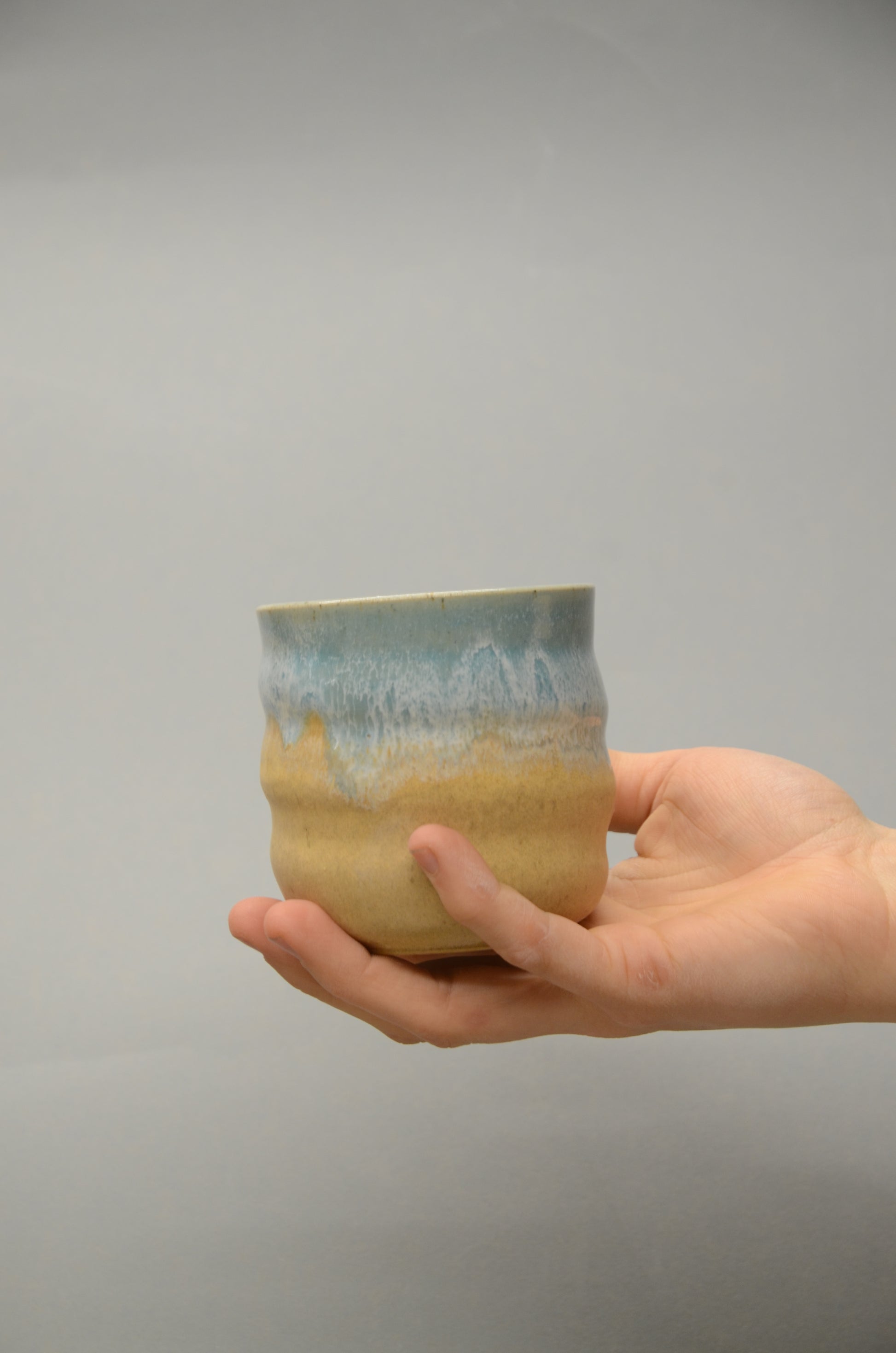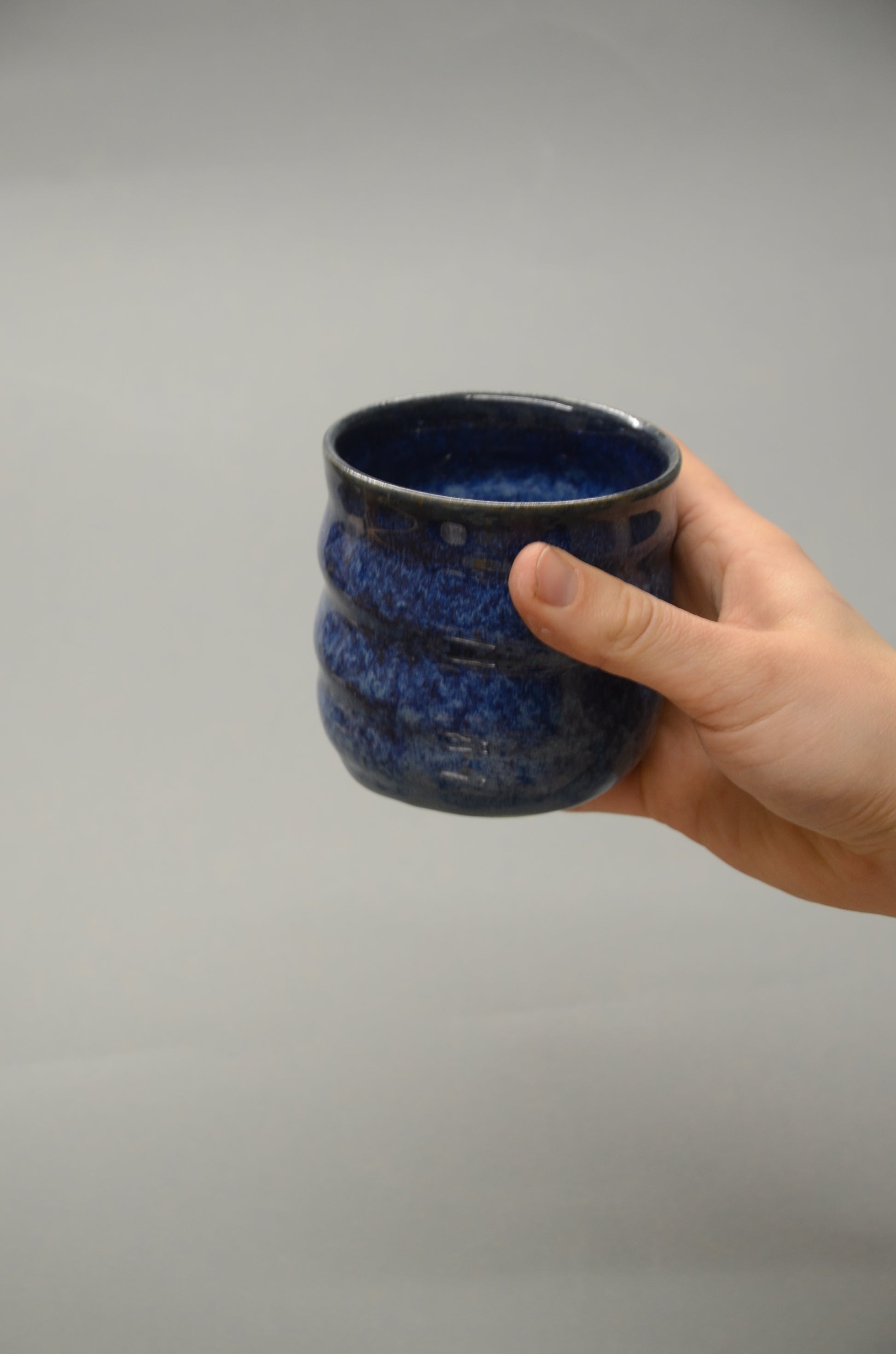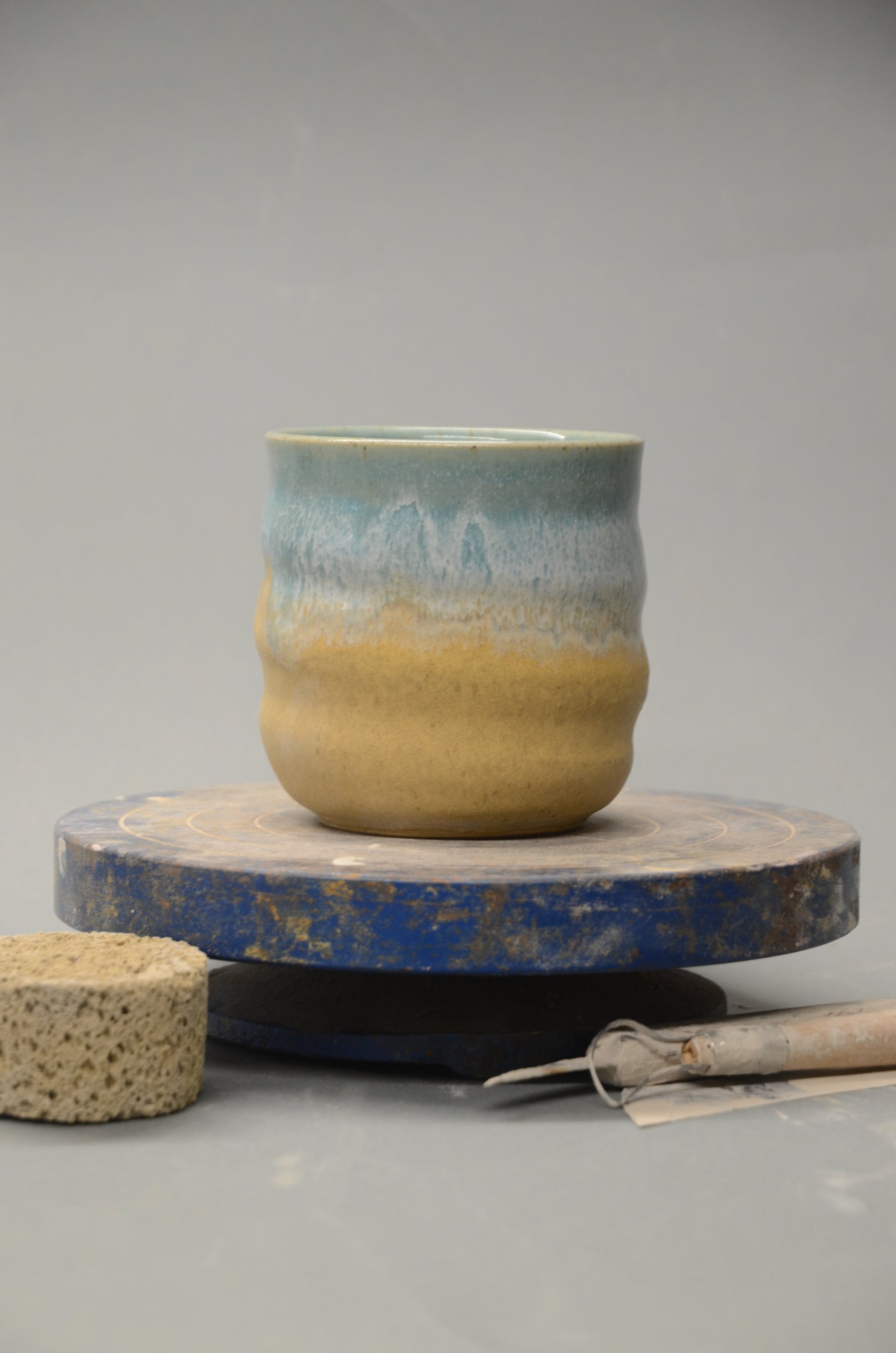 Dieser Becher wurde von mir per Hand an der Töpferscheibe aus Steinzeugton gedreht, abgedreht und nach einem ersten Brand sorgfältig glasiert und ein zweites Mal gebrannt.
