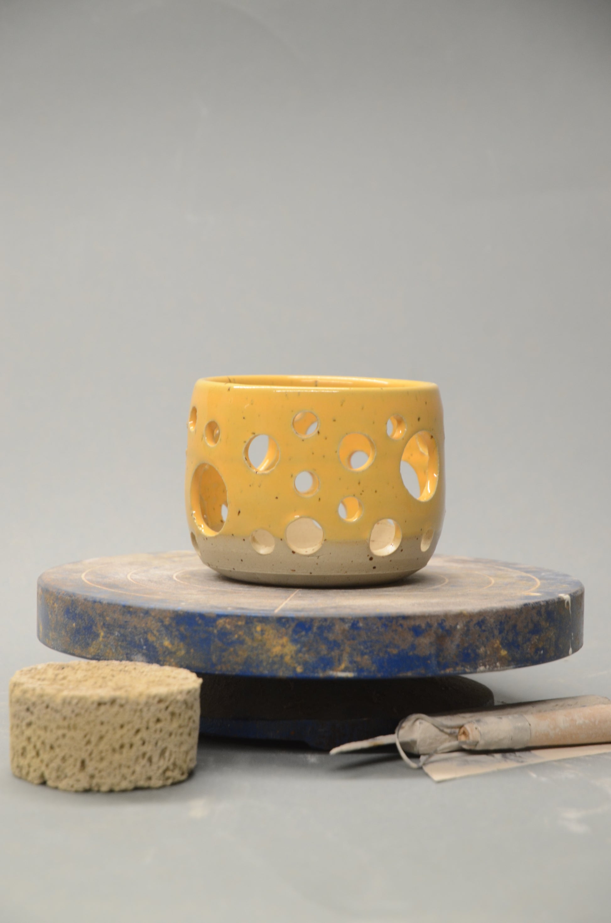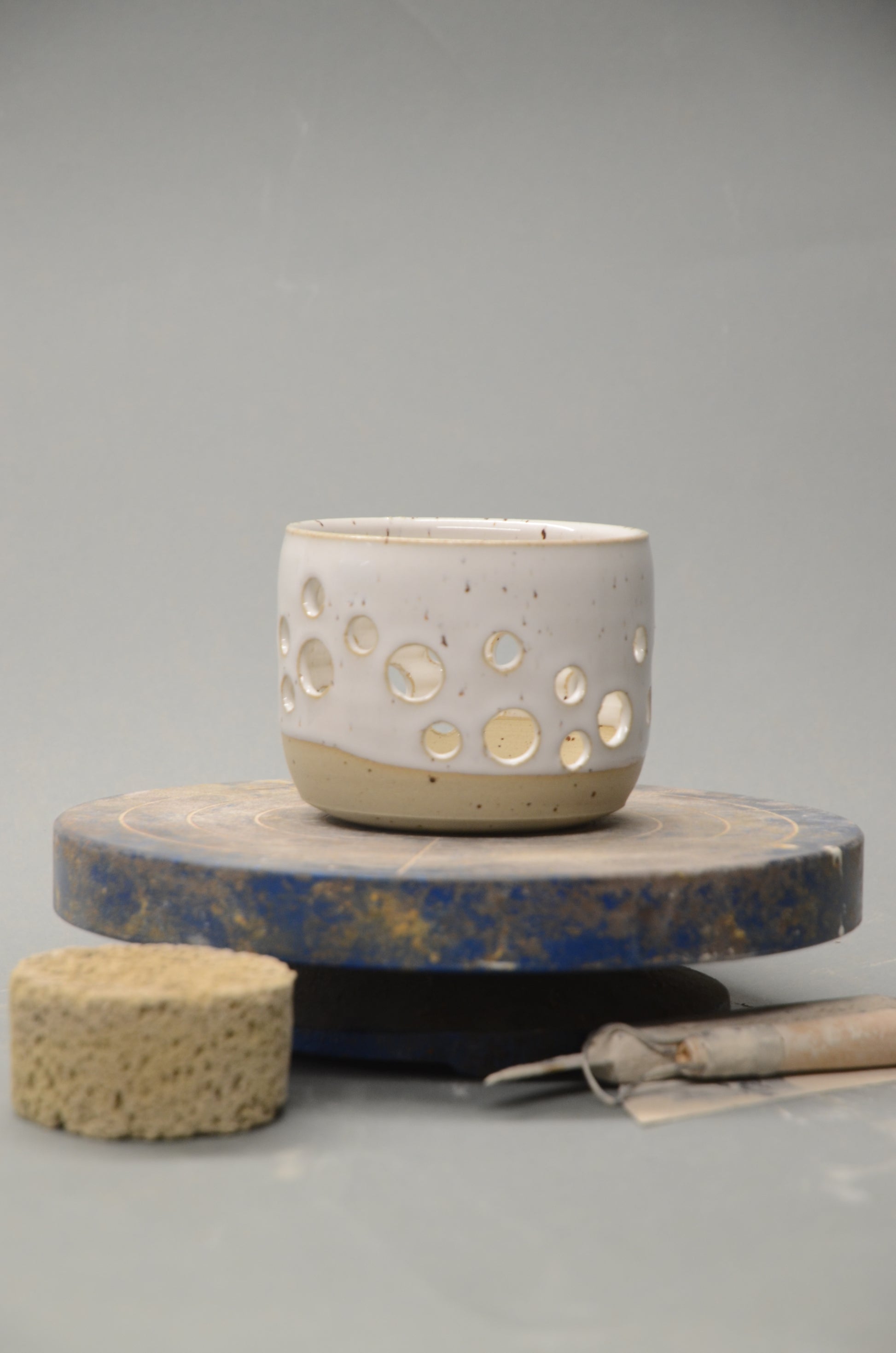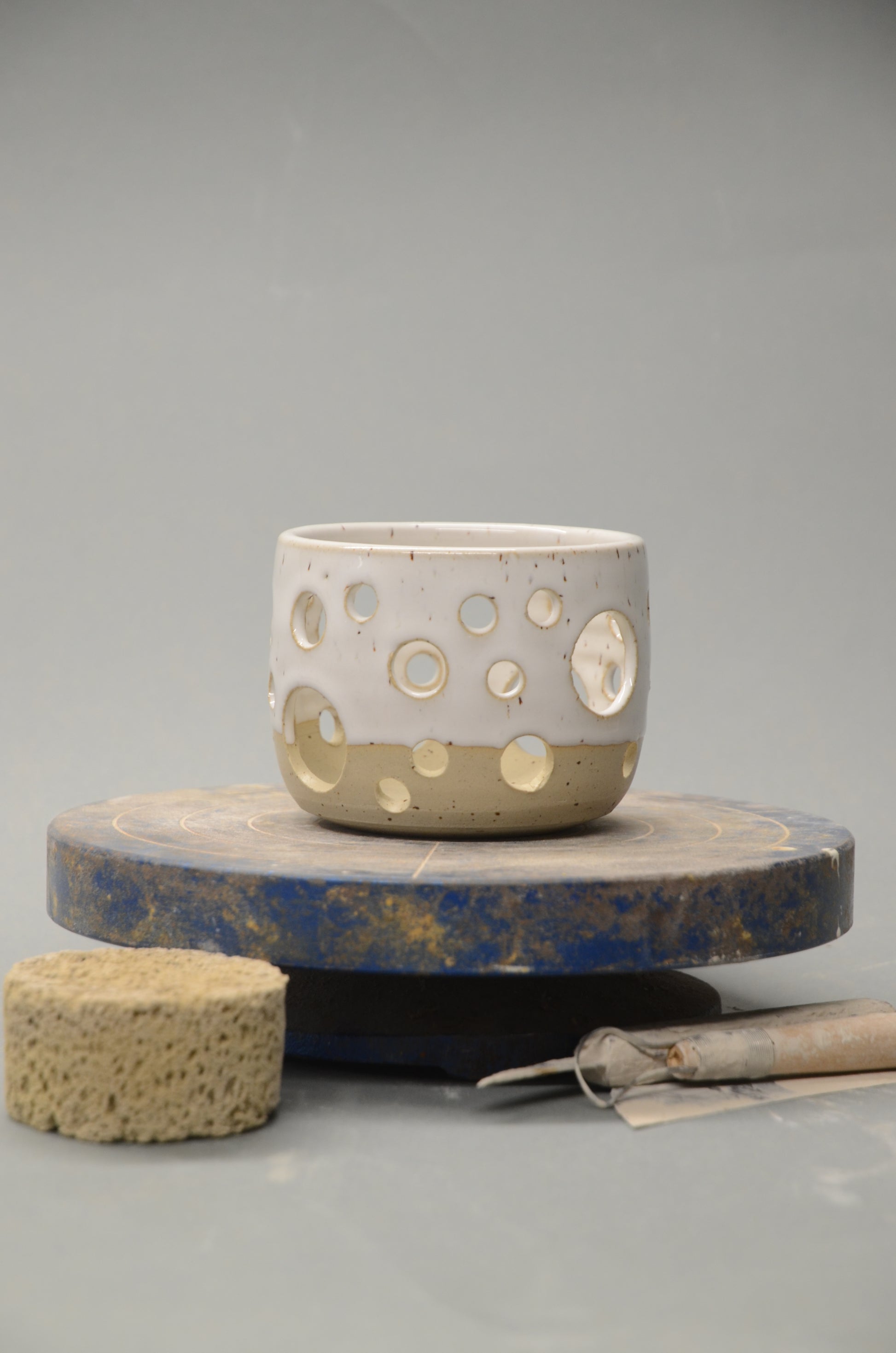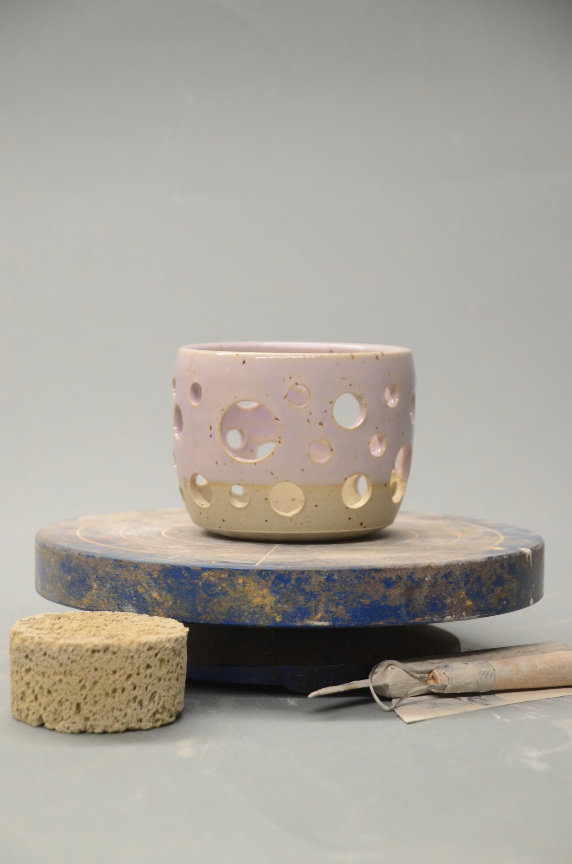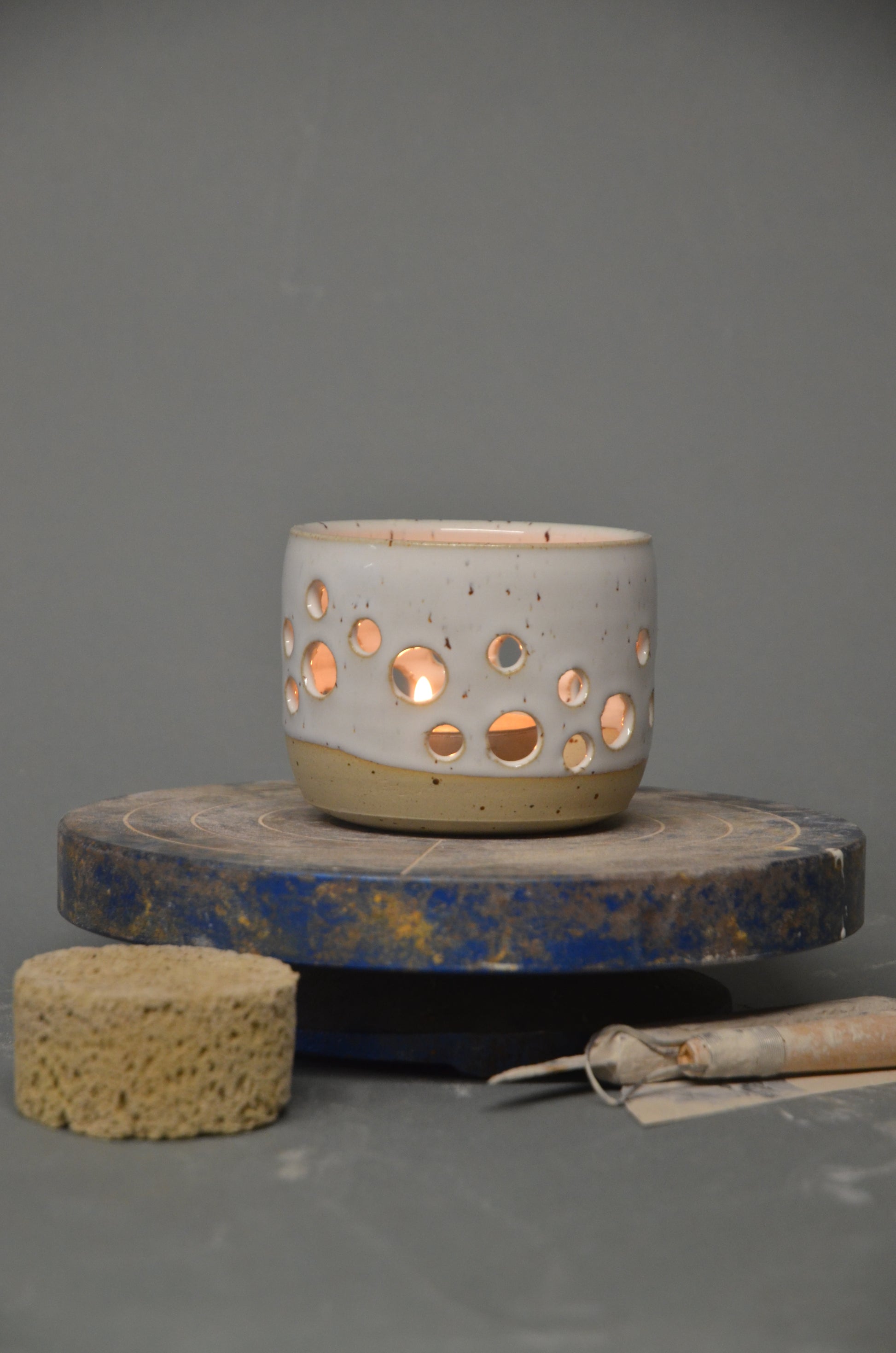 Dieses kleine Windlicht wurde von mir per Hand an der Töpferscheibe aus Steinzeugton gedreht, abgedreht und nach einem ersten Brand sorgfältig glasiert und ein zweites Mal gebrannt.