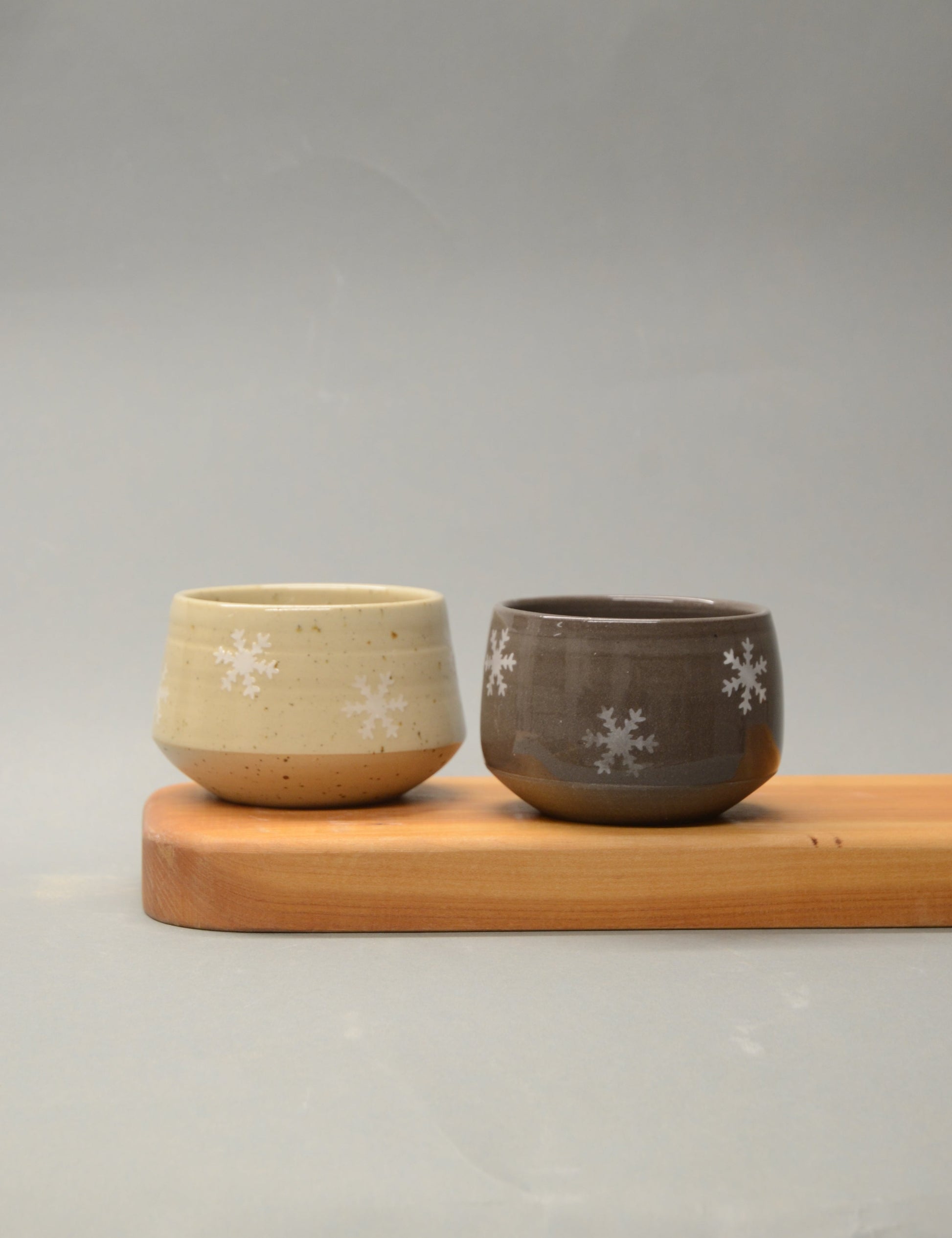 Dieser Becher wurde von mir per Hand an der Töpferscheibe aus Steinzeugton gedreht, abgedreht und nach einem ersten Brand sorgfältig glasiert und ein zweites Mal gebrannt. Mit den bemalten Schneeflocken perfekt für die Winterzeit.